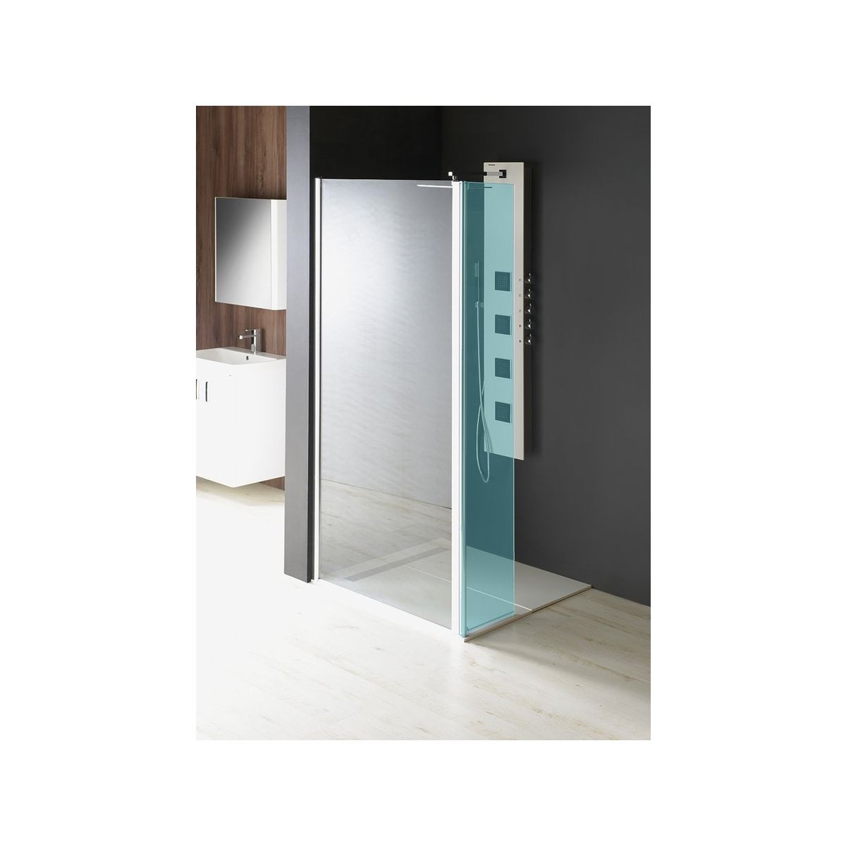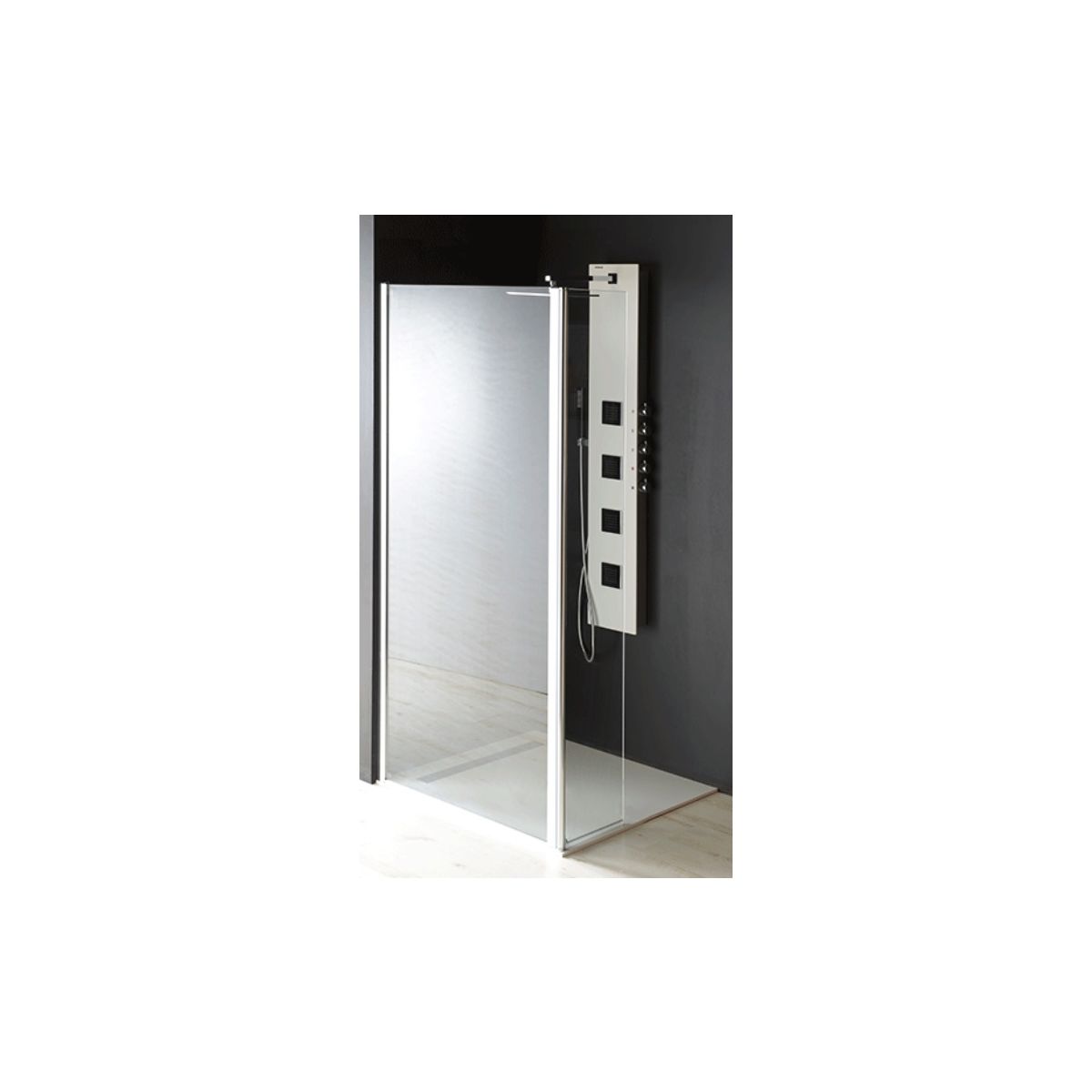 Auf dem Foto ist die komplette Walk-In-Kabine zu sehen. Der Preis gilt nur für die Vorderwand ohne Seitenwand.