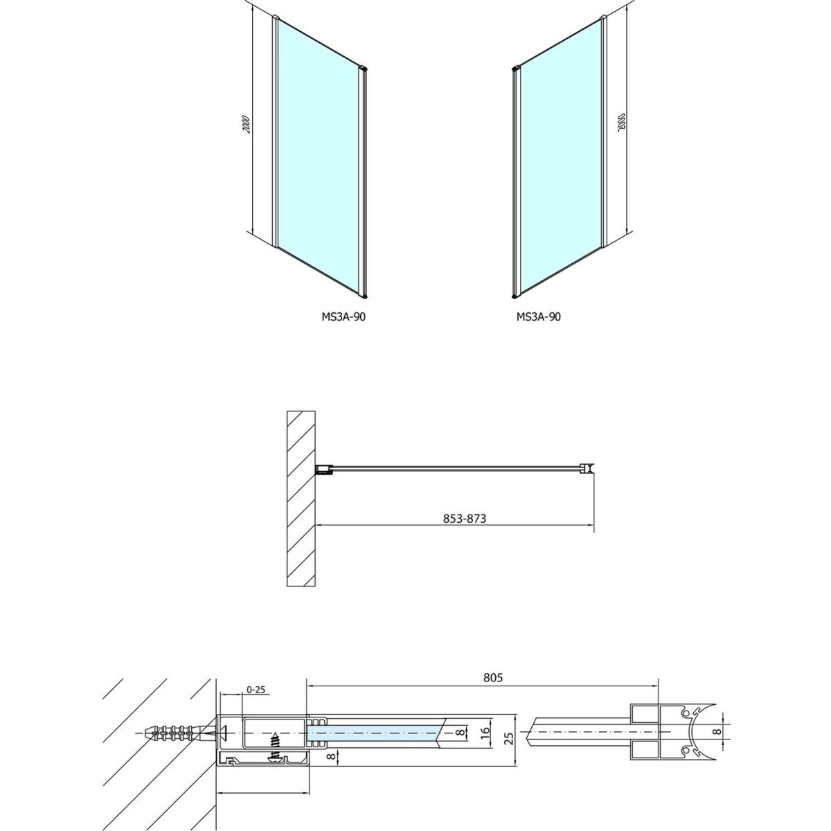 - Um eine L-förmige Walk-In-Kabine zu schaffen, ist für die Befestigung der Wand ein zusätzliches festes Paneel/eine zusätzliche Wand MS3B (separat erhältlich) erforderlich