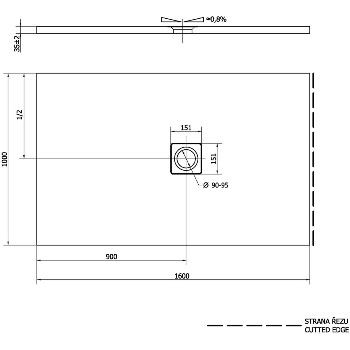 - Eine Seite der Duschwanne in dieser Größe ist zugeschnitten (nicht fertiggestellt – siehe Schema), die Duschwanne sollte so platziert werden, dass die markierte Seite nicht sichtbar ist