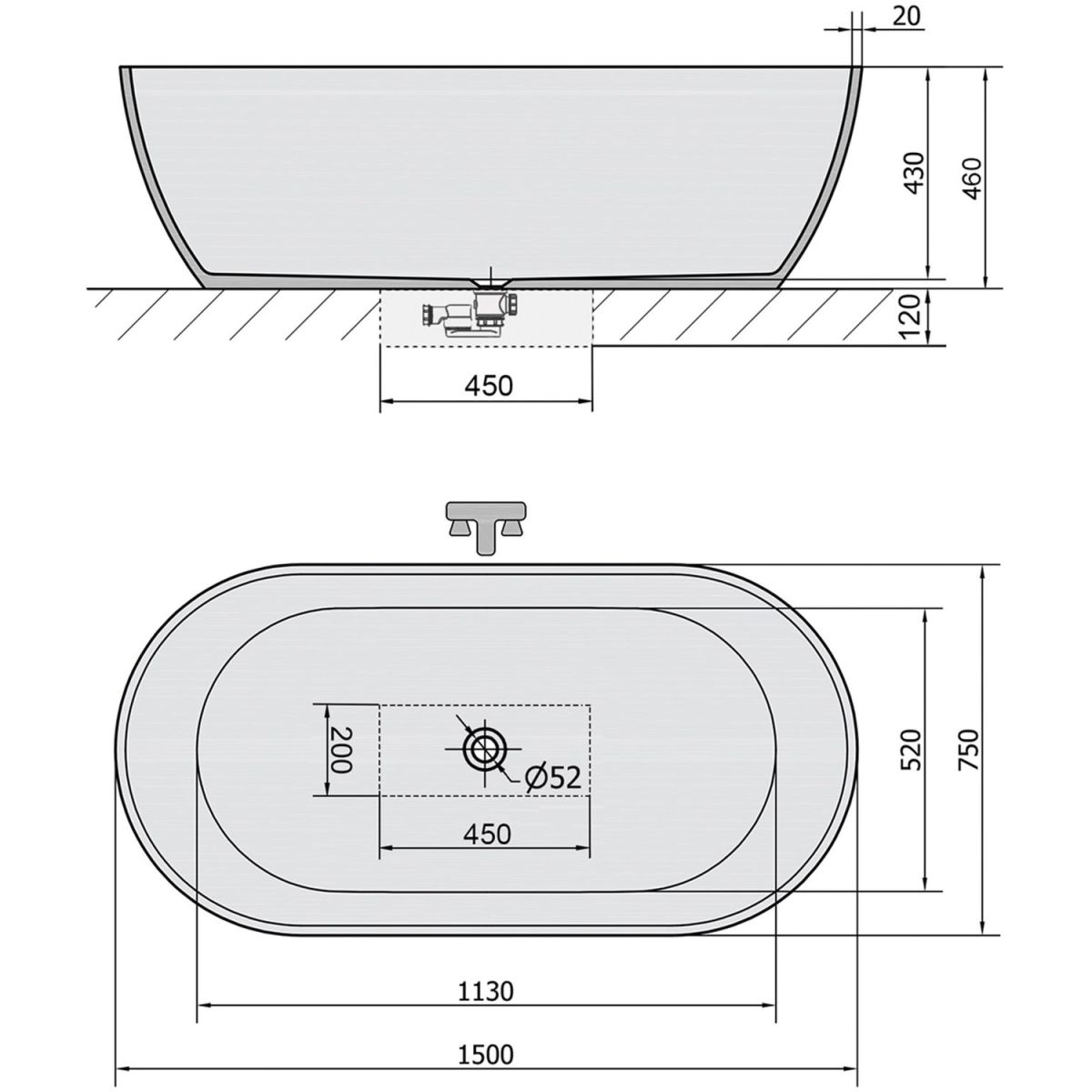 - Bei Installation mit Siphon über dem Boden ist eine Unterkonstruktion für die Badewanne (separat erhältlich) zu verwenden