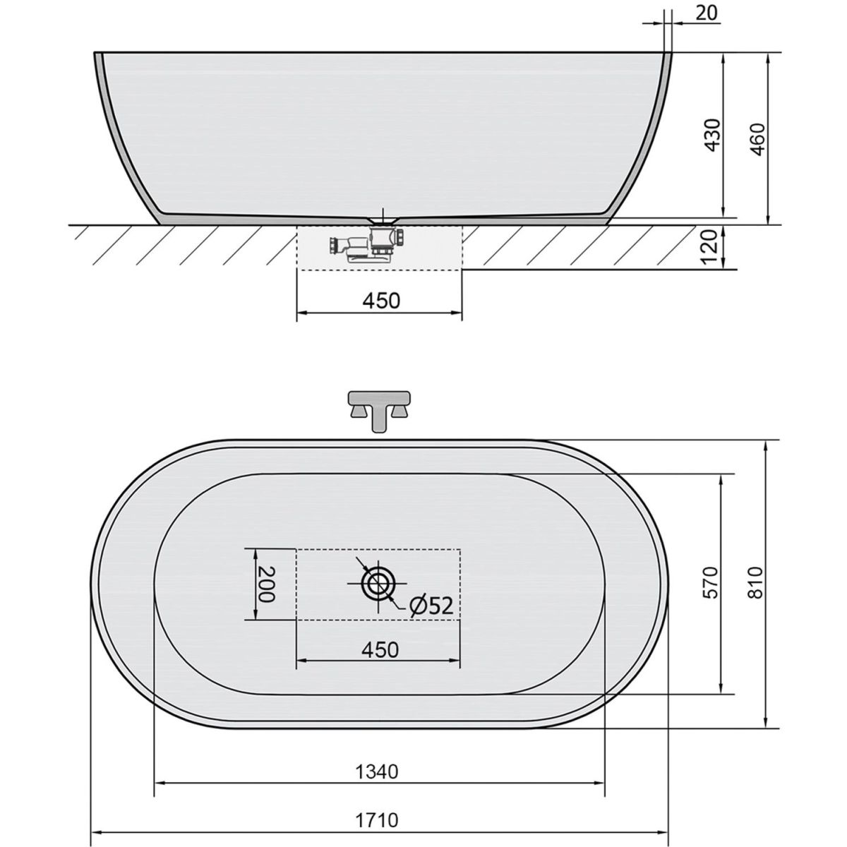 - Bei Installation mit Siphon über dem Boden muss eine Konstruktion unter der Wanne (separat erhältlich) verwendet werden