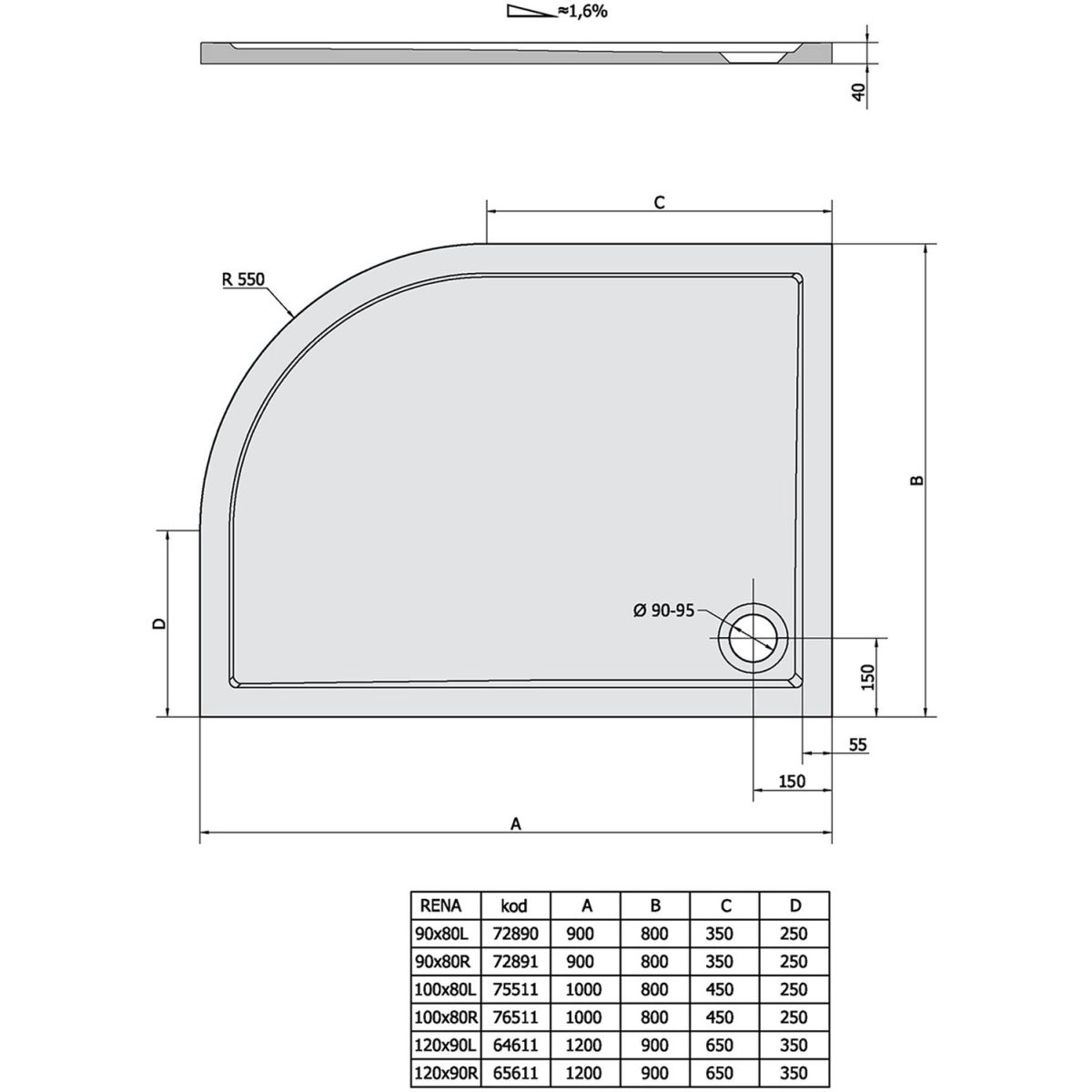 Polysan Rena Halbrunde Duschwanne 120x90 cm weiß 65611