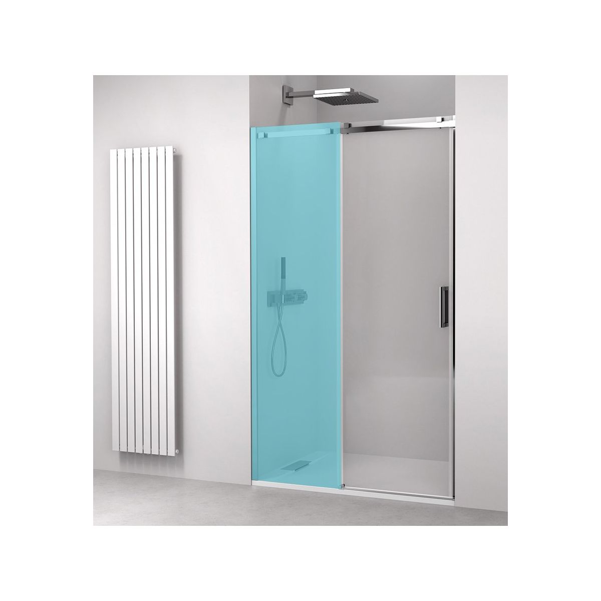 - Die Tür besteht aus einem Schiebe- und einem festen Teil