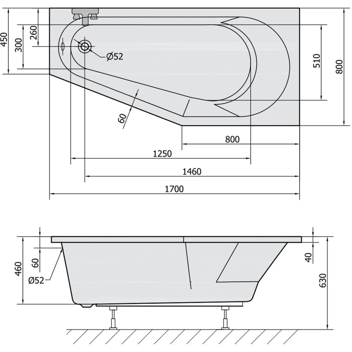 Polysan Tigra Eckbadewanne 170x80 cm rechtsseitig weiß 90611