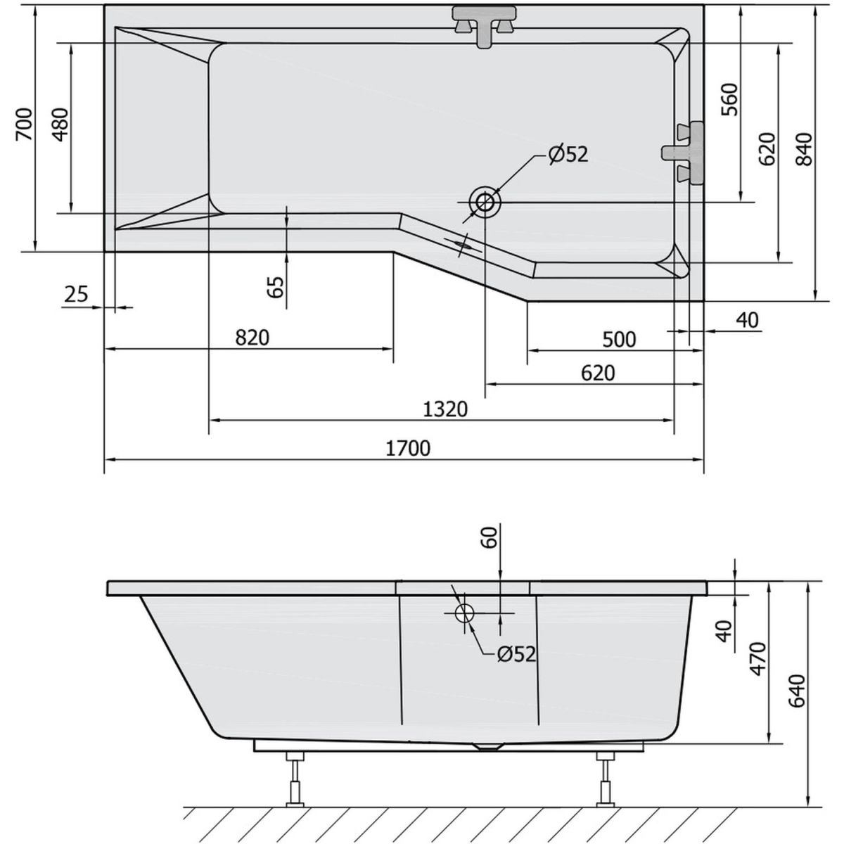 - Durchmesser des Abflusses: 52 mm