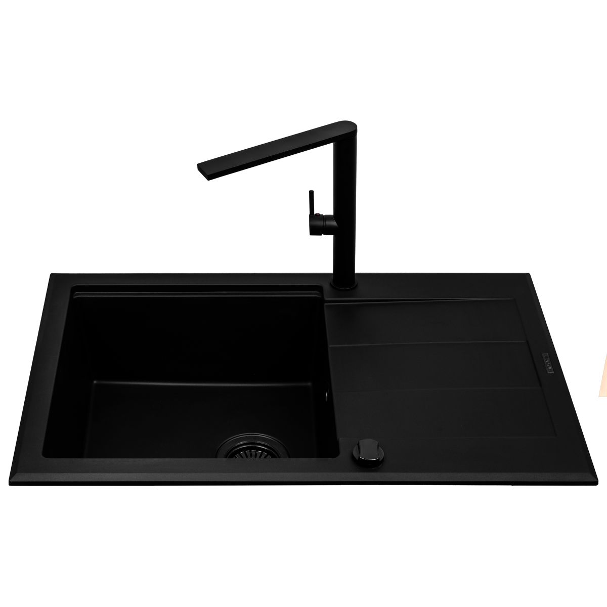 Spüle Sparta (78x48) im Set mit neuer Armatur Trigono – alle Elemente in Schwarz. Pyramis-Spülen sind bekannt für ihre hohe Qualität und ihr innovatives Design.