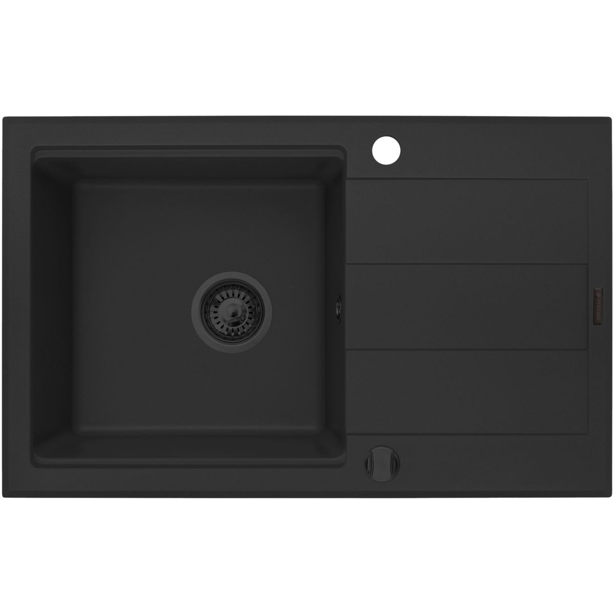 Spülbecken Sparta (78x48) im Set mit neuer Flexos-Armatur – alle Elemente in Schwarz.