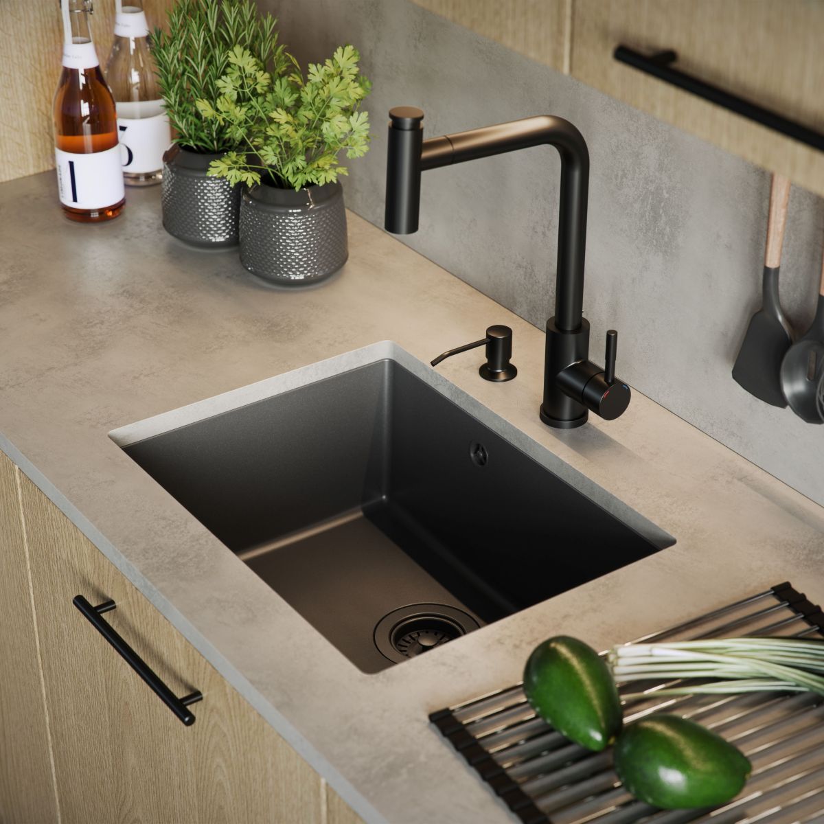 ALEC ist eine Kollektion von Kammern für Unterbausysteme. Diese Lösung ermöglicht eine Maximierung der Kammertiefe und bietet außergewöhnlichen Arbeitskomfort, da die Kammer keine Kanten auf der Arbeitsplatte aufweist. Die großen und geräumigen Kammern können zu Systemen kombiniert werden, z. B. zu doppelten Kombinationen für die Zubereitung von Speisen und das Spülen. Ergänzt durch eine farblich abgestimmte Armatur und einen Spender verwöhnt dieses Set die Sinne mit einer harmonischen Komposition in der Küche.