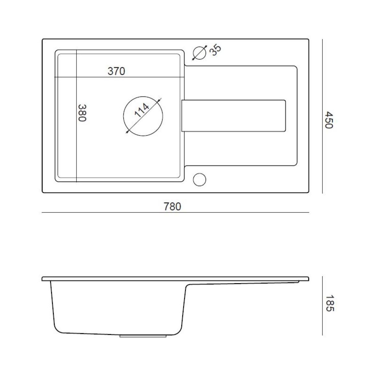 - Umkehrbare Spüle (universell) – die Position der Armatur und des Stopfenknopfs hängt davon ab, in welche Richtung die Spüle eingebaut wird