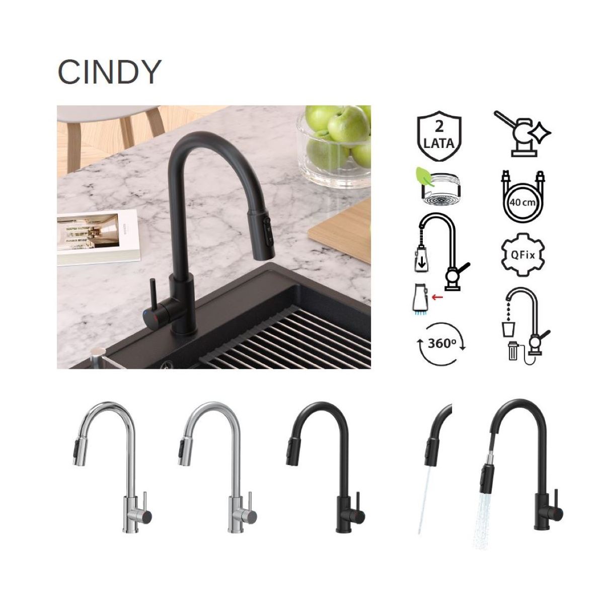Die CINDY-Armatur ist eine Küchenarmatur aus Stahl, die modernes Design mit fortschrittlichen Funktionen verbindet und sich perfekt in die Anforderungen moderner Küchen einfügt. Die Möglichkeit des Anschlusses an einen Wasserfilter und eine zusätzliche Taste für gefiltertes Wasser sorgen für kristallklares Wasser und schützen so die Gesundheit der ganzen Familie. Das ist nicht nur komfortabel, sondern auch eine praktische Lösung für den Alltag.