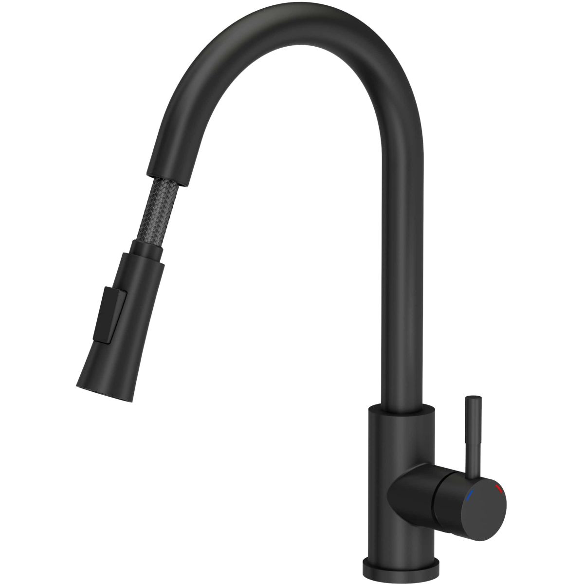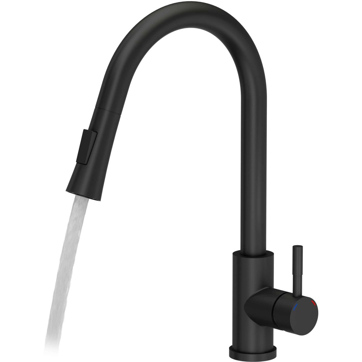 - schwarze Stahlarmatur, Höhe 42,5 cm, mit ausziehbarem Auslauf und Umstellventil für die Brausenfunktion (Armatur mit QFix-Montagesystem, d. h. mit Mutter, ohne zusätzliche Werkzeuge)