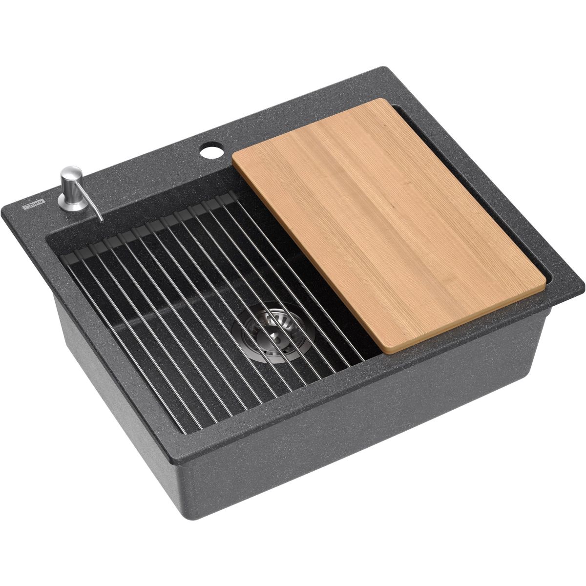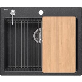 Kurt 110 GraniteQ ist eine Spüle mit einer einzigen, äußerst geräumigen Kammer, obwohl die erforderliche Unterbauhöhe weiterhin nur 60 cm beträgt, was der gängigsten Größe für Küchenschränke entspricht. Das verwendete Material, das mit einem hochwertigen Bindemittel verbunden ist, bildet eine sehr glatte Oberfläche, die die Sauberhaltung erleichtert. Die Spüle ist standardmäßig mit einem umfangreichen Zubehörset ausgestattet, das die Arbeit in der Spülbeckenkammer erheblich erleichtert. Am Rand ist ein Spülmittelspender angebracht, wodurch zusätzliche Behälter für Reinigungsmittel überflüssig werden und das Spülmittel nicht über den Rand der Spüle hinausläuft. Im Inneren der Spülbeckenkammer wurde ein zusätzlicher Rand angebracht, auf dem die aufrollbare Qmata-Matte aufliegt. Das Brett hat seinen Platz auf der Oberseite der Kammer. Durch die Verwendung dieser Elemente wird die Arbeitsfläche in der Küche vergrößert und die Kammer kann erfolgreich als zusätzlicher Arbeitsbereich zum Schneiden oder Trocknen genutzt werden.