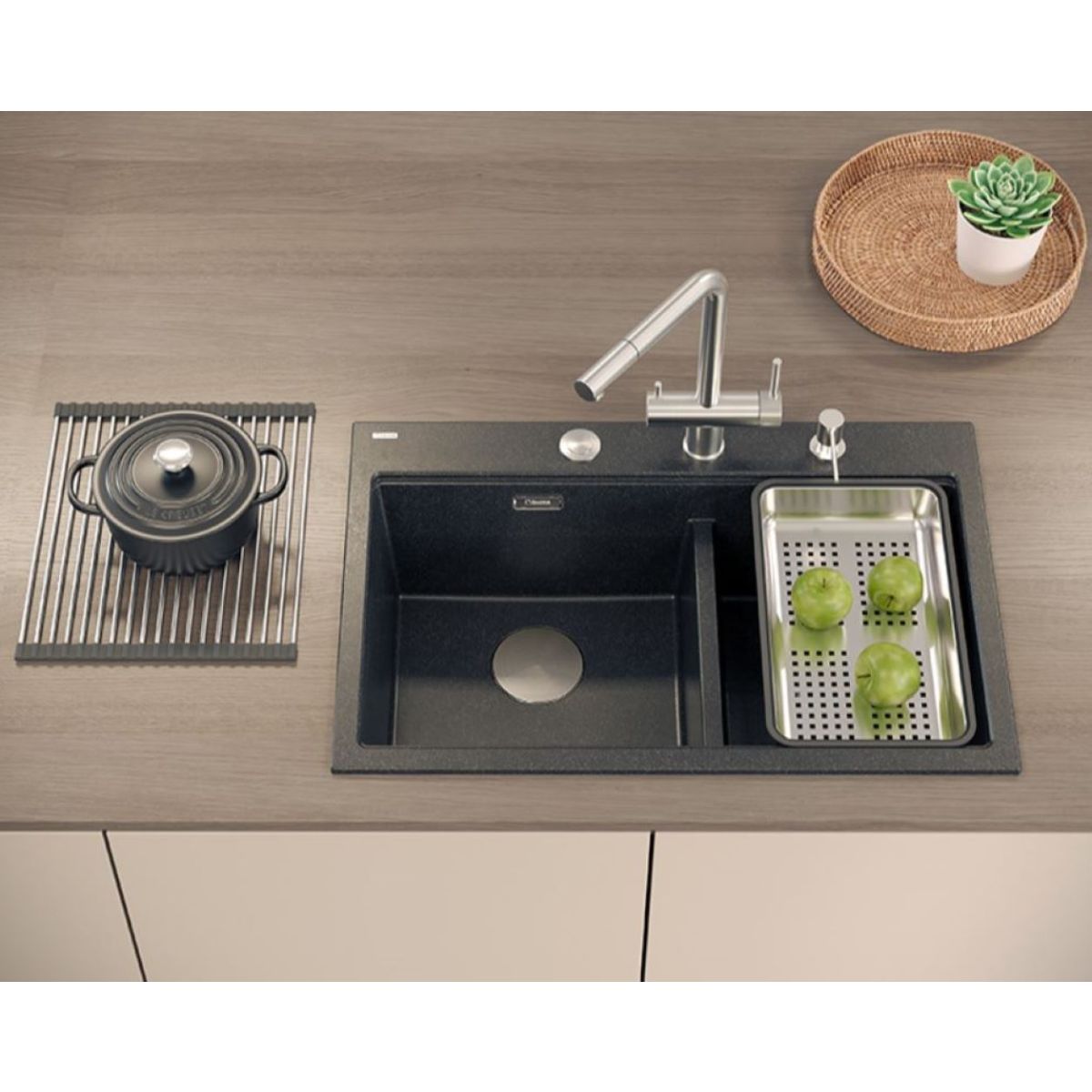 Der speziell entworfene Rand ermöglicht die Verwendung von funktionalen Accessoires In der Stahlvariante: ein Schneidebrett aus Eschenholz, eine aufrollbare Matte und ein Abtropfgestell.Spülbecken mit Armaturen in PVD-Beschichtung werden mit zwei funktionalen Zubehörteilen geliefert, nämlich einem soliden Brett und einem Abtropfeinsatz. Dank dieser Extras wird der Arbeitsbereich erheblich vergrößert, was den Komfort bei der Arbeit erhöht.
