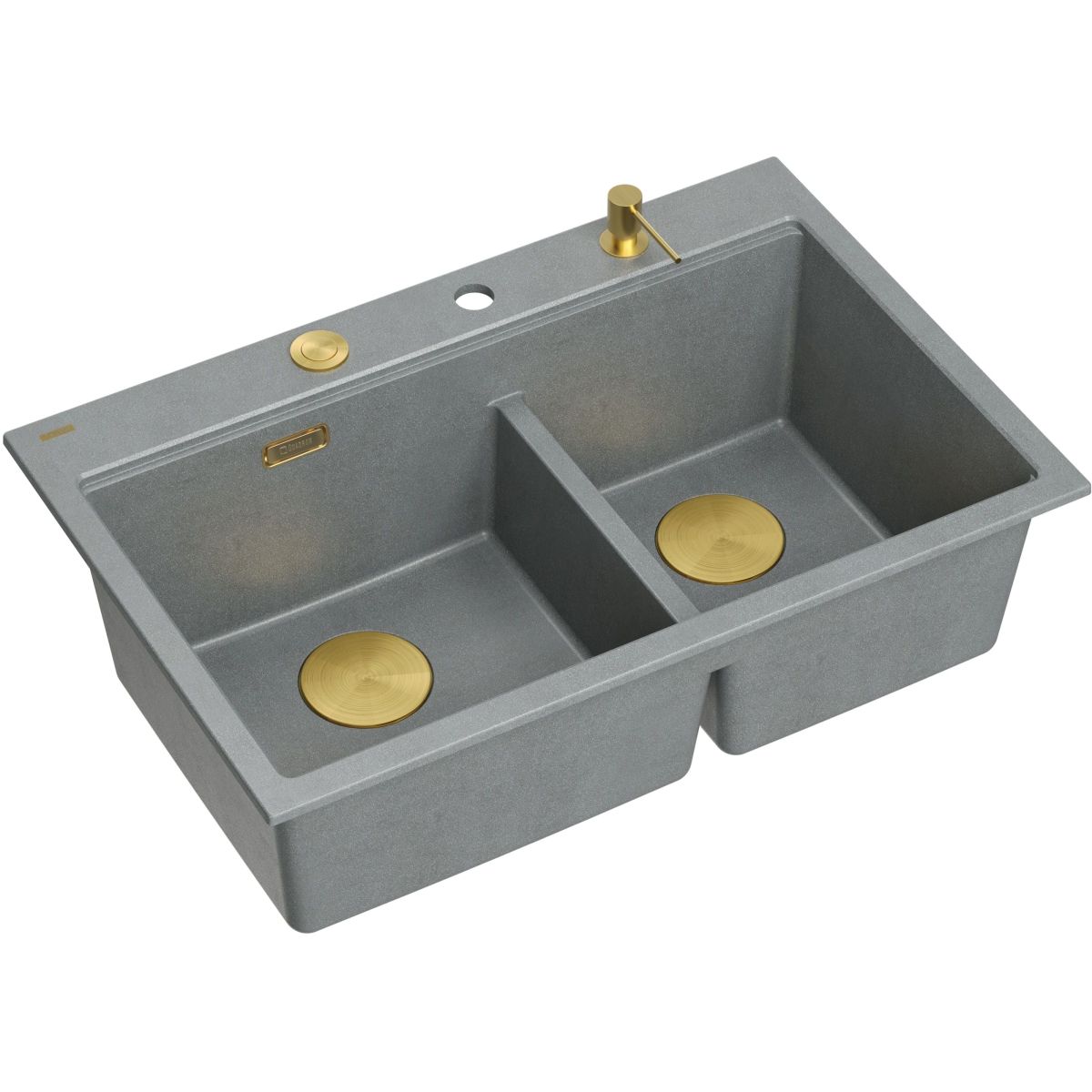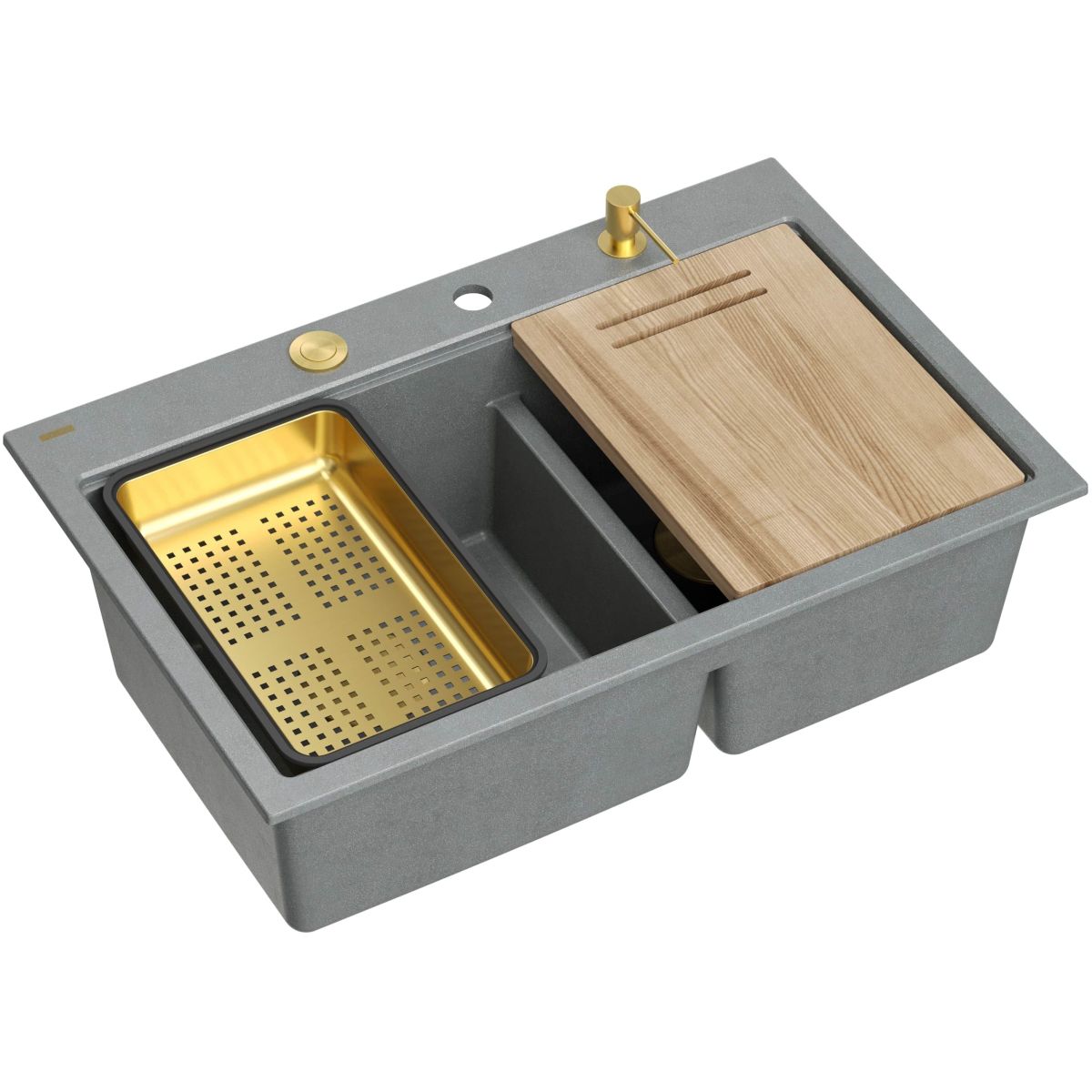 Marc 120 Workstation GraniteQ ist eine Doppelspüle in der Farbe Silver Stone mit goldenen Elementen, die Eleganz und Stil mit außergewöhnlicher Funktionalität verbindet. Sie ist ideal für den intensiven Gebrauch und erfüllt selbst die Erwartungen der anspruchsvollsten Nutzer, da sie eine Reihe von Vorteilen bietet, die die täglichen Küchenarbeiten effizienter und komfortabler machen.