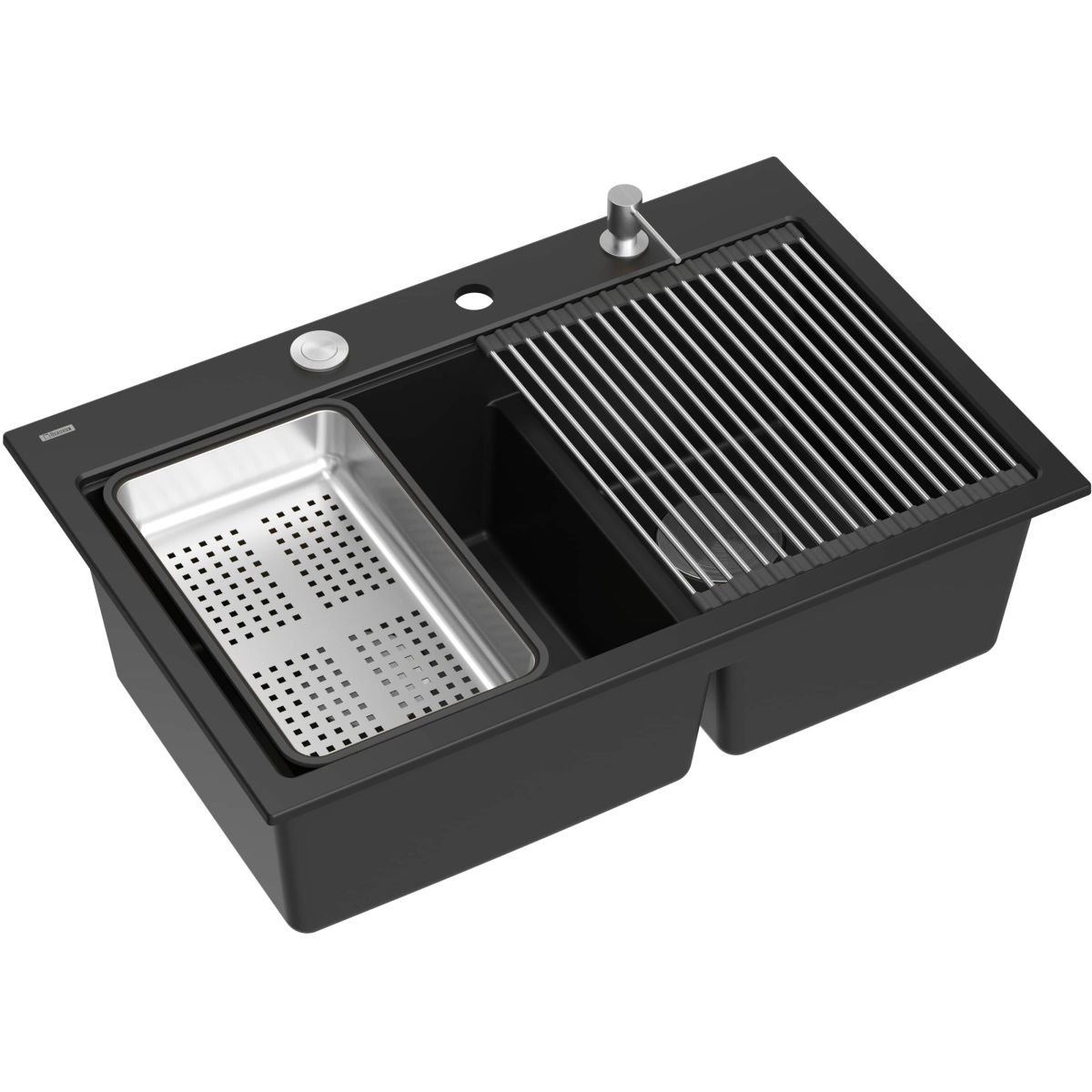 Marc 120 Workstation GraniteQ ist eine Doppelspüle in der Farbe Pure Carbon, die Eleganz und Stil mit außergewöhnlicher Funktionalität verbindet. Sie ist ideal für den intensiven Gebrauch und erfüllt selbst die Erwartungen der anspruchsvollsten Nutzer, da sie eine Reihe von Vorteilen bietet, die die täglichen Küchenarbeiten effizienter und komfortabler machen.