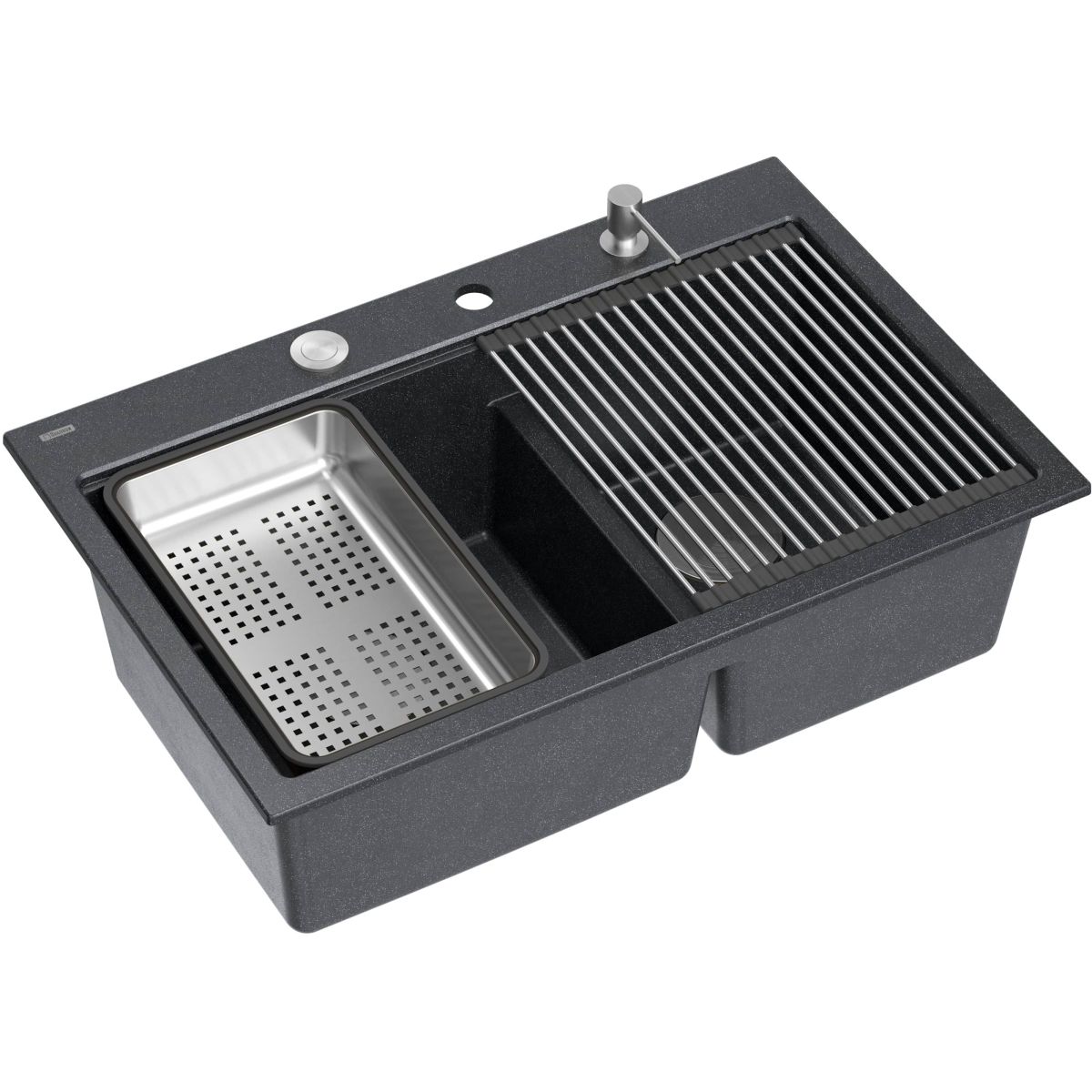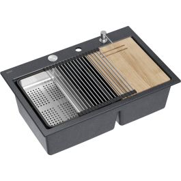 Marc 120 Workstation GraniteQ ist eine Doppelspüle in der Farbe Black Diamond, die Eleganz und Stil mit außergewöhnlicher Funktionalität verbindet. Sie ist ideal für den intensiven Gebrauch und erfüllt selbst die Erwartungen der anspruchsvollsten Nutzer, da sie eine Reihe von Vorteilen bietet, die die täglichen Küchenarbeiten effizienter und komfortabler machen.