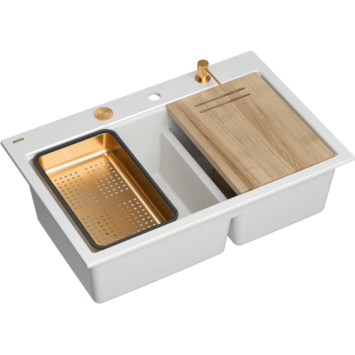 Marc 120 Workstation GraniteQ ist eine Doppelspüle in Schneeweiß mit Kupferelementen, die Eleganz und Stil mit außergewöhnlicher Funktionalität verbindet. Sie ist ideal für den intensiven Gebrauch und erfüllt selbst die Erwartungen der anspruchsvollsten Nutzer, da sie eine Reihe von Vorteilen bietet, die die täglichen Küchenarbeiten effizienter und komfortabler machen.