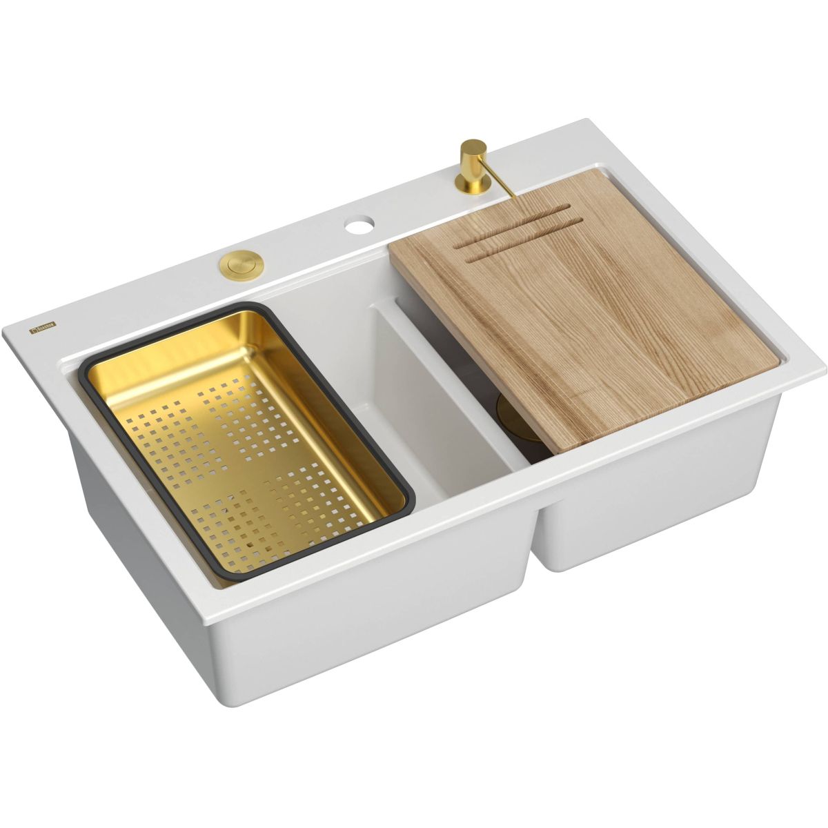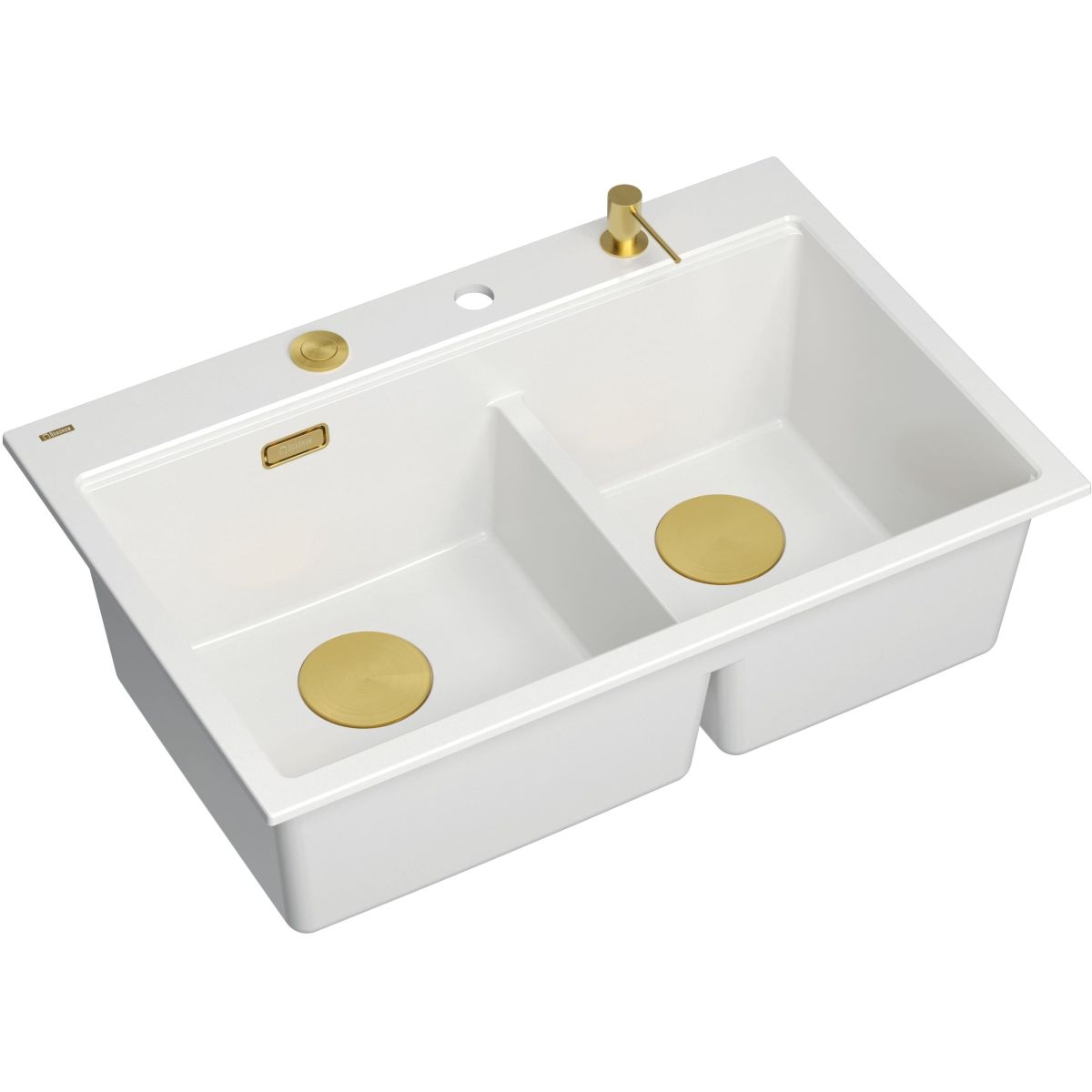 Marc 120 Workstation GraniteQ ist eine Doppelspüle in Schneeweiß mit goldenen Elementen, die Eleganz und Stil mit außergewöhnlicher Funktionalität verbindet. Sie ist ideal für den intensiven Gebrauch und erfüllt selbst die Erwartungen der anspruchsvollsten Nutzer, da sie eine Reihe von Vorteilen bietet, die die täglichen Küchenarbeiten effizienter und komfortabler machen.