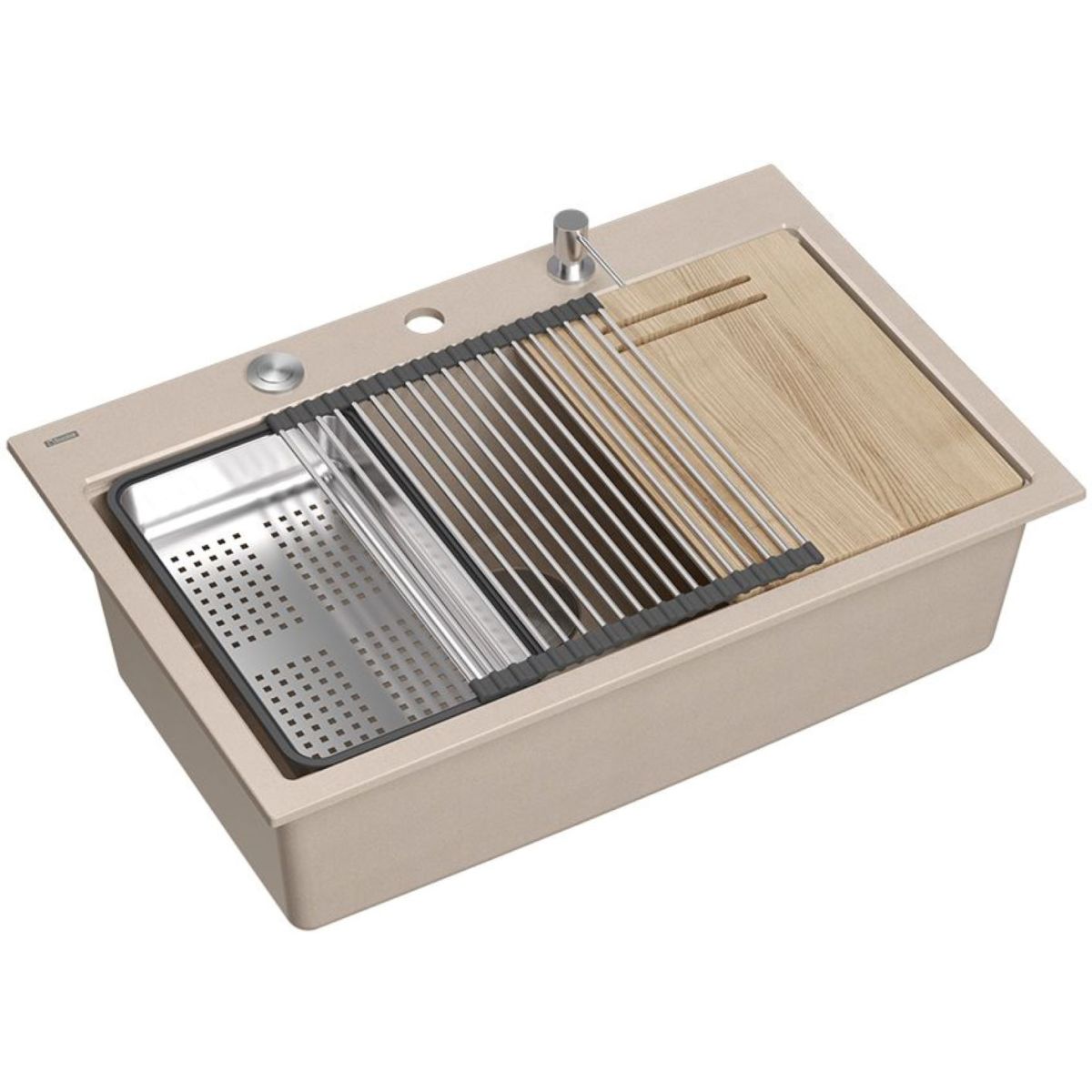 Die Variante mit Stahlarmaturen wird zusätzlich durch drei funktionale Accessoires in derselben Farbe (Rollmatte, Spender, Einsatz) und ein Küchenbrett aus Holz ergänzt.
