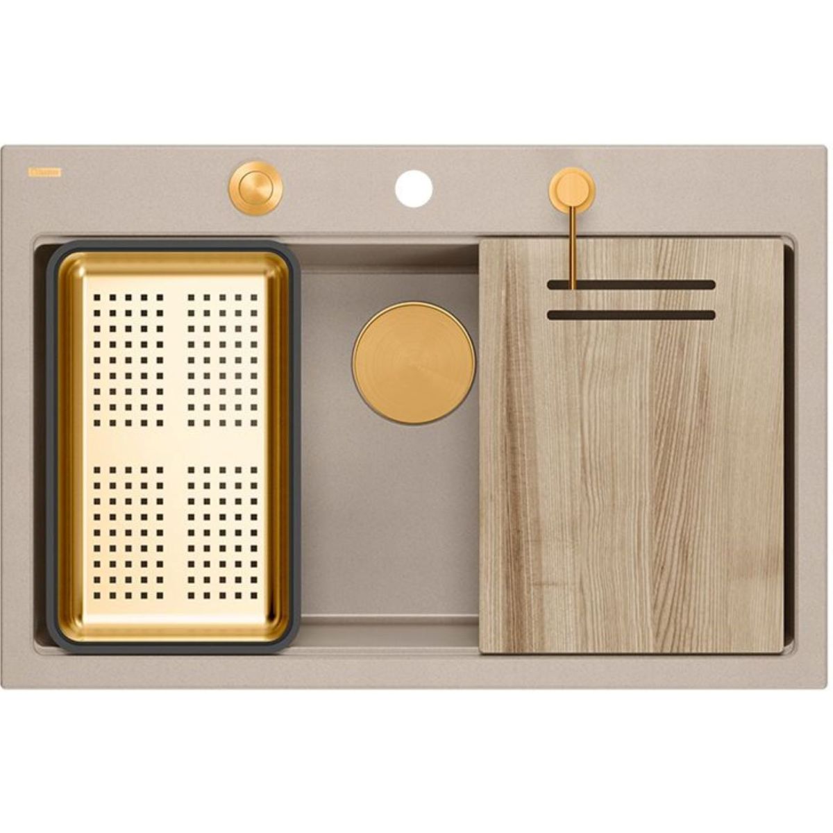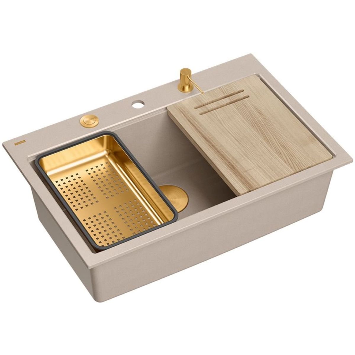 Spülbecken mit PVD-beschichteten Armaturen werden hingegen mit folgenden zusätzlichen Küchenaccessoires geliefert: Spender, Stahleinsatz und Holzschneidebrett.