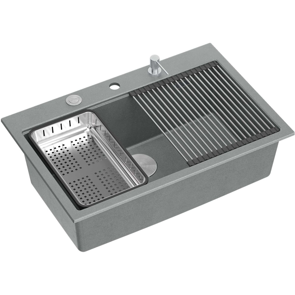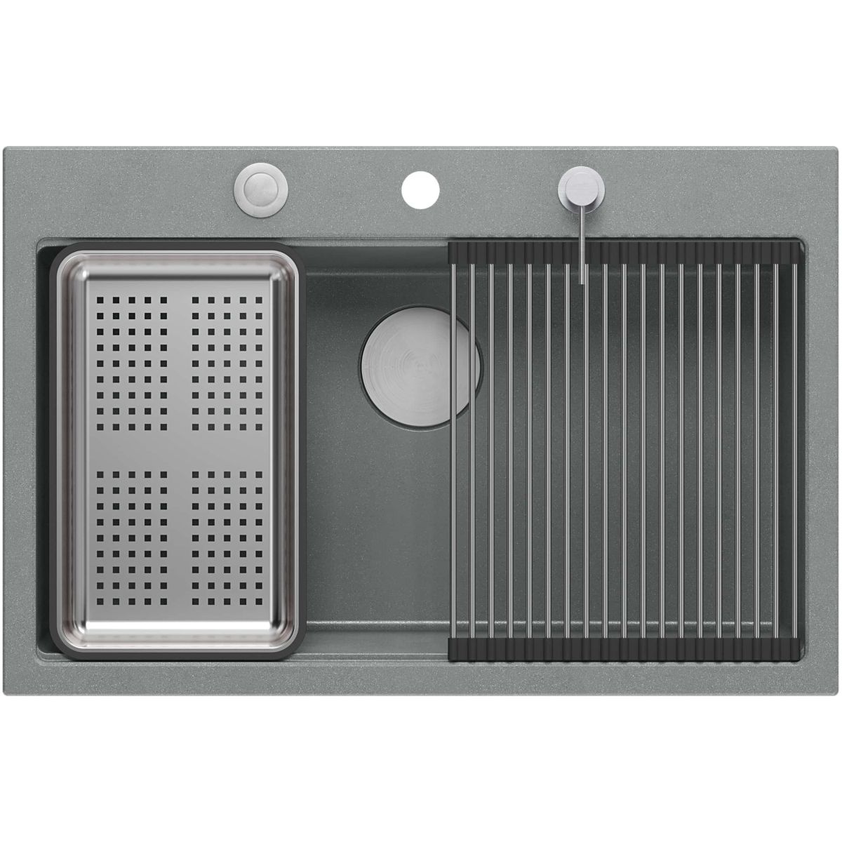Die Variante mit Stahlarmaturen wird zusätzlich durch drei funktionale Accessoires in derselben Farbe (Rollmatte, Spender, Einsatz) und ein Küchenbrett aus Holz ergänzt.