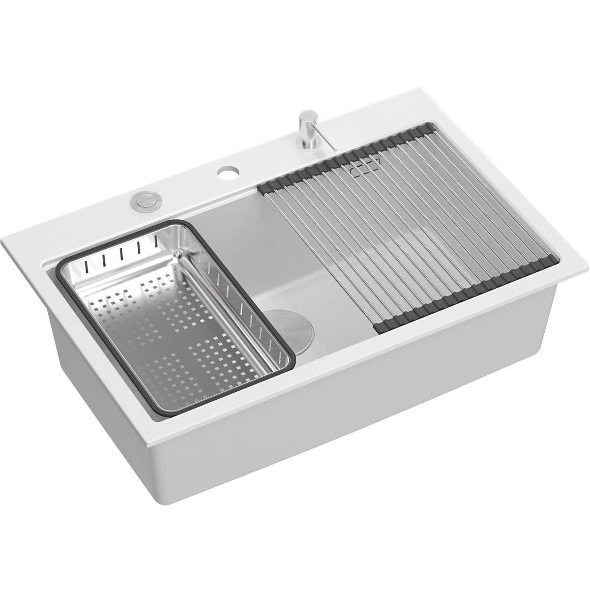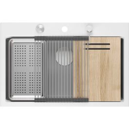 Die Variante mit Stahlarmaturen wird zusätzlich durch drei funktionale Accessoires in derselben Farbe (Rollmatte, Spender, Einsatz) und ein Küchenbrett aus Holz ergänzt.