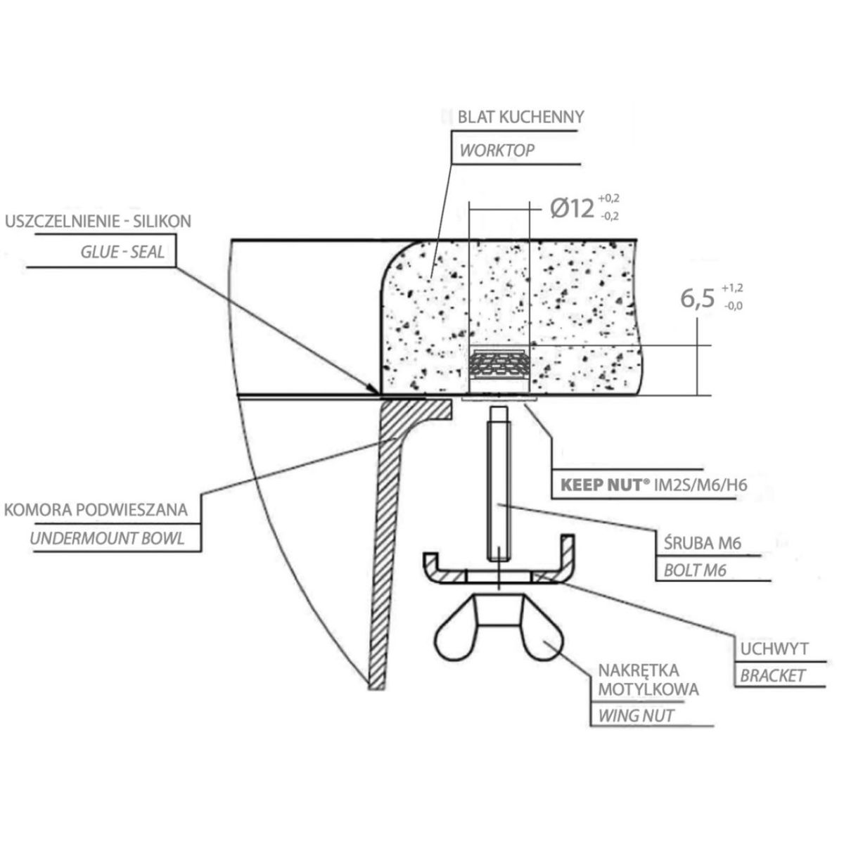 KEEP-NUT-Einsätze sind für die Montage von Unterbau-Spülbecken in dünnen Arbeitsplatten mit einer Mindeststärke von 12 mm aus harten Materialien wie Quarzkomposit, Marmor, Granit, Konglomerat, Glas oder HPL vorgesehen. KEEP-NUT-Einsätze ermöglichen eine einfache, schnelle und klebstofffreie Installation durch Eindrücken und mechanische Verankerung im Material und garantieren eine sichere Montage des Spülbeckens auch in sehr dünnem Material.