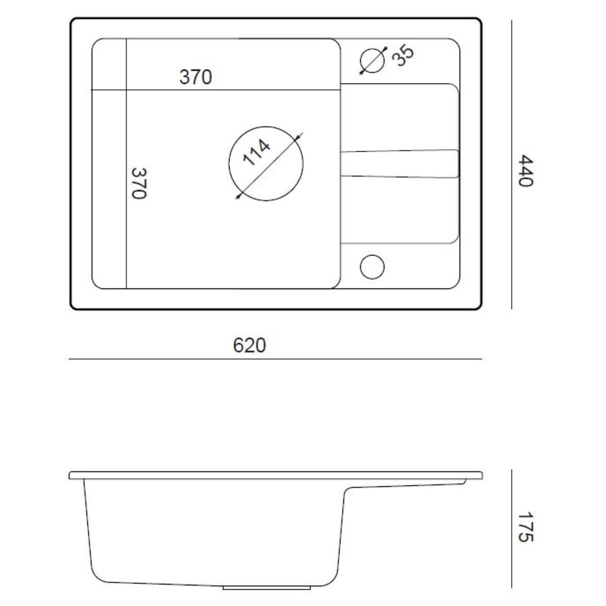 1. Wendbare Spüle mit den Maßen 62 x 44 x 17,5 cm aus GraniteQ mit manuellem Siphon