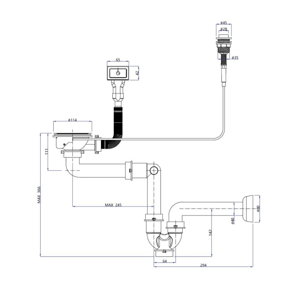 Vertikaler Siphonablauf 3,5 Zoll. Er ist für 1-Kammer-Spülbecken aus Stahl mit oder ohne Abtropffläche vorgesehen. Es besteht die Möglichkeit, ihn an einen Geschirrspüler anzuschließen.