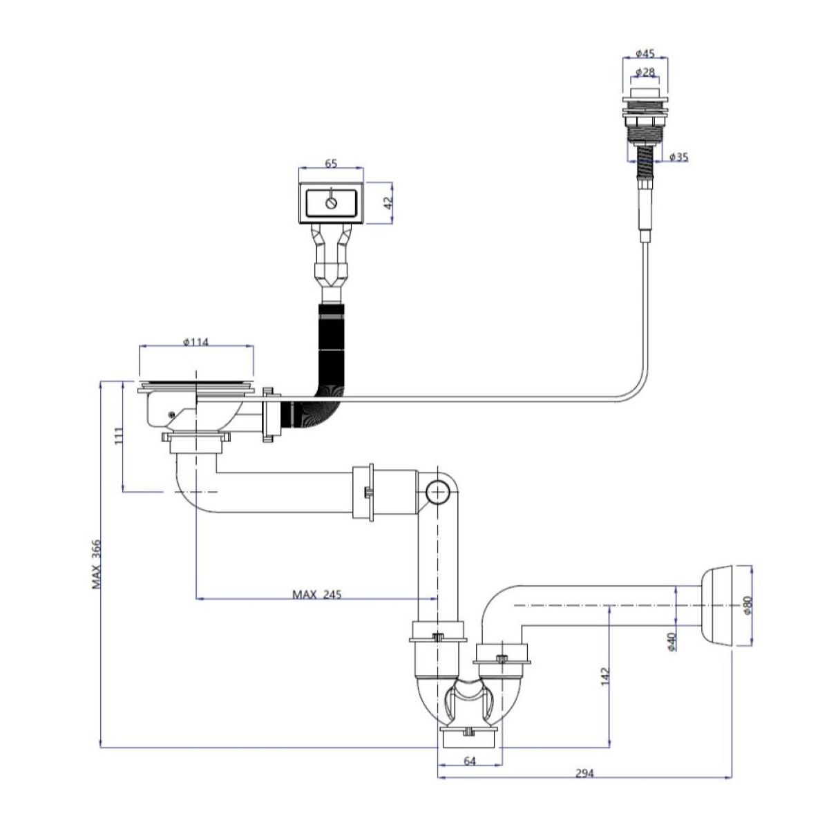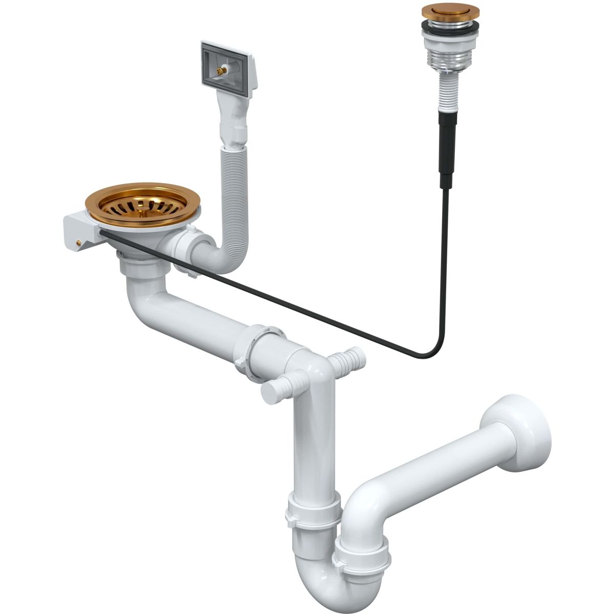 Vertikaler Siphonablauf 3,5 Zoll. Er ist für 1-Kammer-Spülbecken aus Stahl mit oder ohne Abtropffläche vorgesehen. Automatisch mit Pusk-to-Open-Knopf. Kann an einen Geschirrspüler angeschlossen werden.