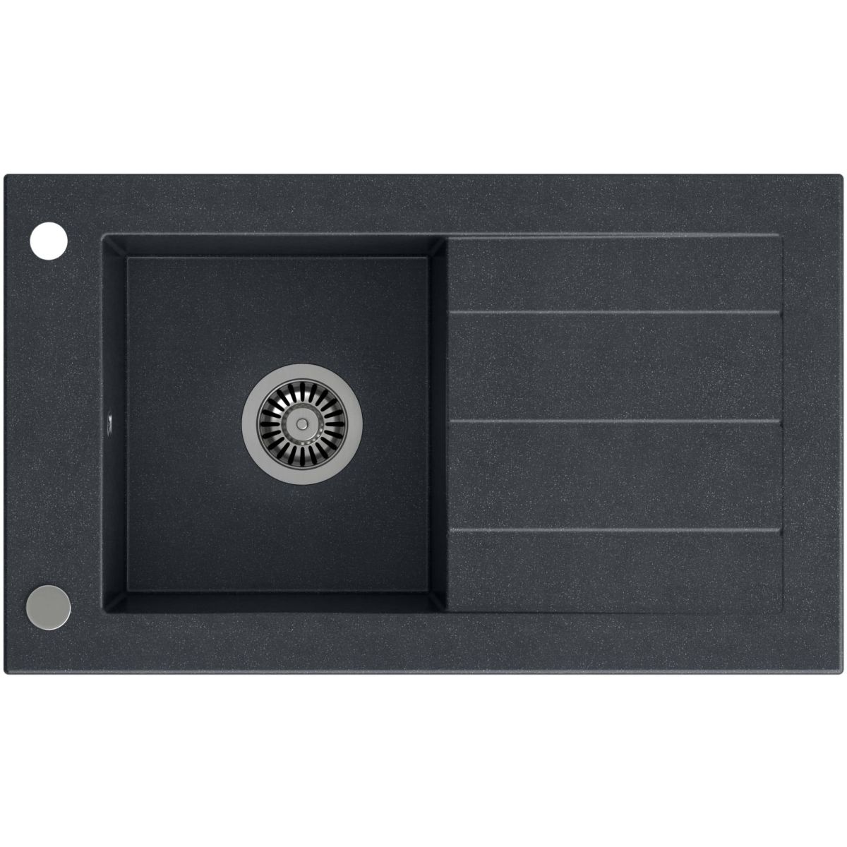 1-Kammer-Spülbecken mit Abtropffläche, komplett mit manuellem Siphon und Blindstopfen. Das Besondere an diesem Modell ist der seitliche Flansch für die Montage der Armatur. Dank dieser Lösung befindet sich die Armatur, die traditionell zwischen der Kammer und dem Abtropfbereich montiert wird, in diesem Fall in der Ecke der Spüle, rechts oder links davon, je nachdem, ob die Spüle als links (mit der Kammer auf der linken Seite) oder als rechts (mit der Kammer auf der rechten Seite) montiert wird.