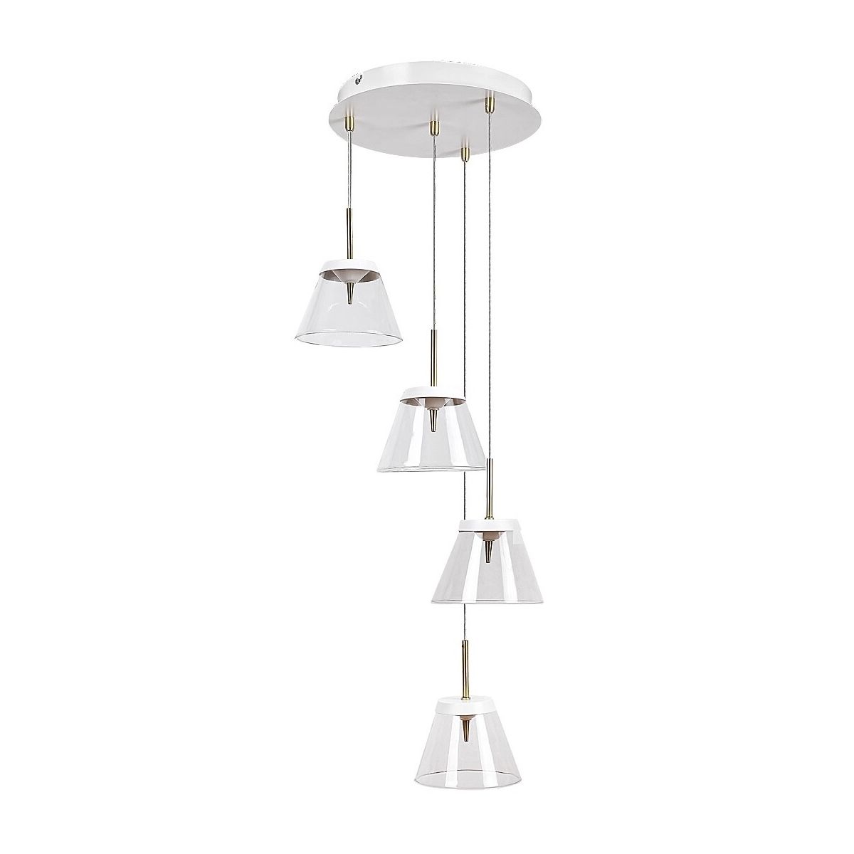 Der aus einer Kombination von Metall und Glas gefertigte vierarmige Kronleuchter Aviana ist besonders für diejenigen zu empfehlen, die einzigartige, effektvolle Accessoires in ihren modernen Wohnungen lieben. Die wunderschöne Lampe Aviana wird sicherlich die Aufmerksamkeit jedes Gastes auf sich ziehen. Wir empfehlen sie vor allem für das Wohn- oder Esszimmer. Die weiß-braune Metallfassung wird durch transparente Lampenschirme und einen großen, runden, dekorativen Sockel in Weiß ergänzt. Vier Lampen, die in unterschiedlichen Höhen aufgehängt sind, machen dieses Modell wirklich spektakulär. Aviana strahlt ein natürliches weißes Licht aus und garantiert einen eleganten, modernen Effekt.