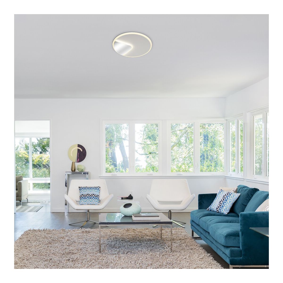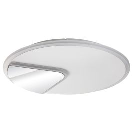 Das Besondere an der modernen Deckenleuchte Boswell mit ihrem schlichten Design ist ihre Spiegelung: Ein Teil der Metall- und Acrylleuchte ist mit einem Spiegel überzogen, der andere Teil ist weiß. Dieses runde Modell in Weiß und Chrom kann im Wohnzimmer oder im Flur montiert werden.