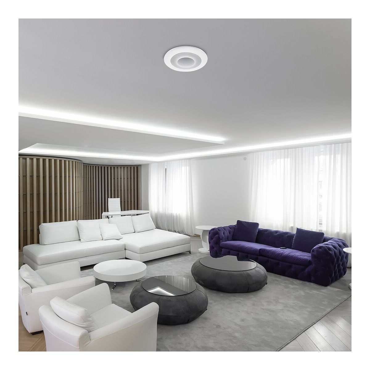 Die Deckenleuchte Calvin ist die perfekte Wahl für Ihr Wohnzimmer, Schlafzimmer oder Kinderzimmer. Diese intelligente Leuchte in Weiß mit weißem Lampenschirm verfügt über zahlreiche Funktionen: Die Helligkeit lässt sich mit einer Fernbedienung stufenlos regulieren, und die Farbtemperatur kann mit einem Wandschalter oder einer Fernbedienung im Bereich von 3000 bis 6000 K verändert werden. Wenn Sie eine besondere Atmosphäre schaffen möchten, können Sie auch die RGB-Beleuchtung nutzen, d. h. die Farben des Lichts ändern. Die aus Metall gefertigte Calvin-Lampe mit Acryldiffusor verfügt außerdem über eine Nachtlichtfunktion, eine Timerfunktion und eine Speicherfunktion, die über einen Wandschalter oder eine Fernbedienung gesteuert werden kann.