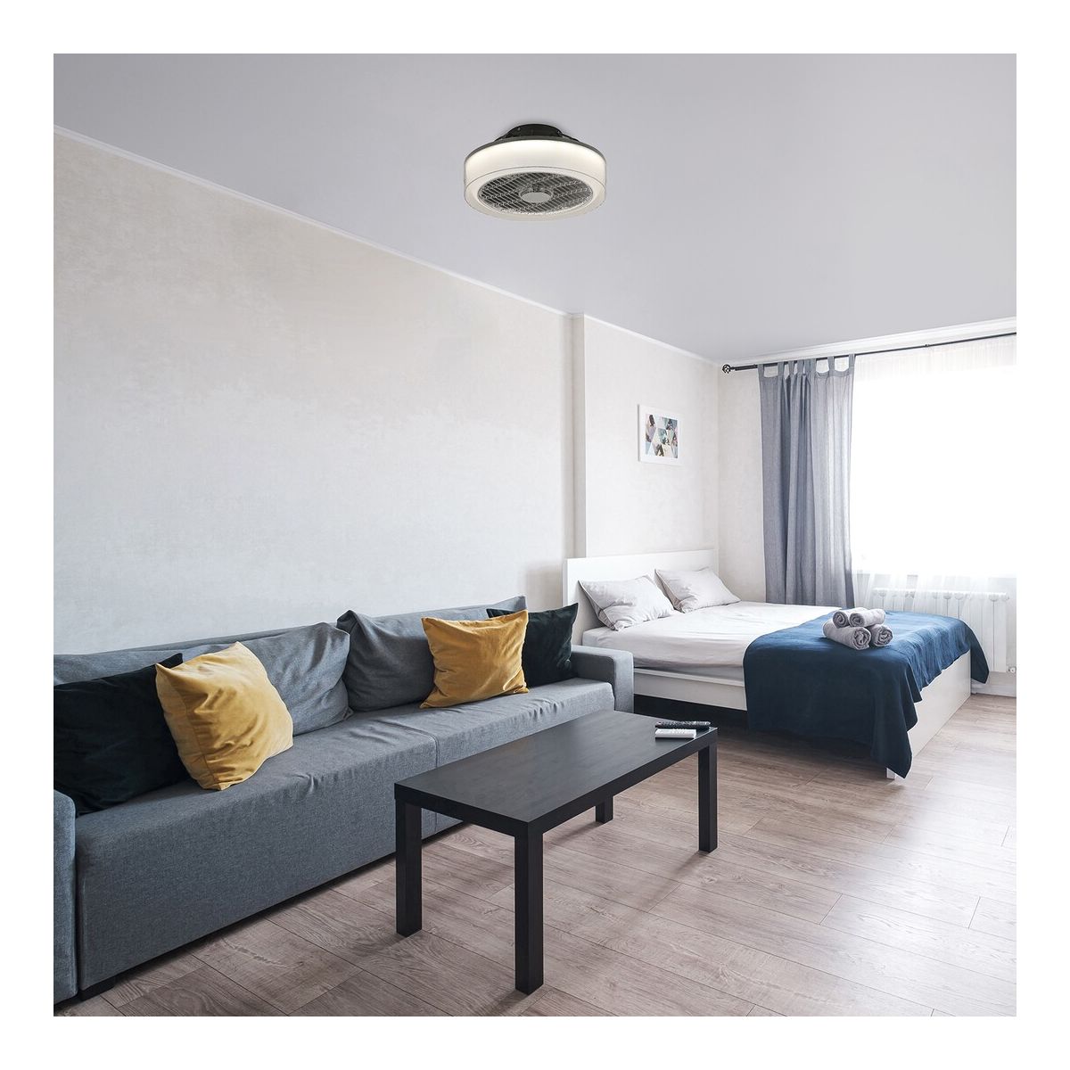 Die moderne Deckenleuchte Dalfon bietet viel mehr als nur durchschnittliche Beleuchtung: Sie verfügt über einen eingebauten Ventilator und weitere außergewöhnliche Funktionen. Sie ist die perfekte Wahl für Ihr Wohnzimmer, Schlafzimmer oder Arbeitszimmer. Die runde, graue Smart-Leuchte aus Metall wird durch einen transparenten Acryldiffusor ergänzt. Die Dalfon-Lampe ist dimmbar, d. h. ihre Helligkeit kann mit einer Fernbedienung nach Belieben eingestellt werden, während ihre Farbtemperatur mit einem Wandschalter oder einer Fernbedienung zwischen 3000 und 6000 K eingestellt werden kann. Die Geschwindigkeit des Ventilators kann in drei Stufen reguliert werden.