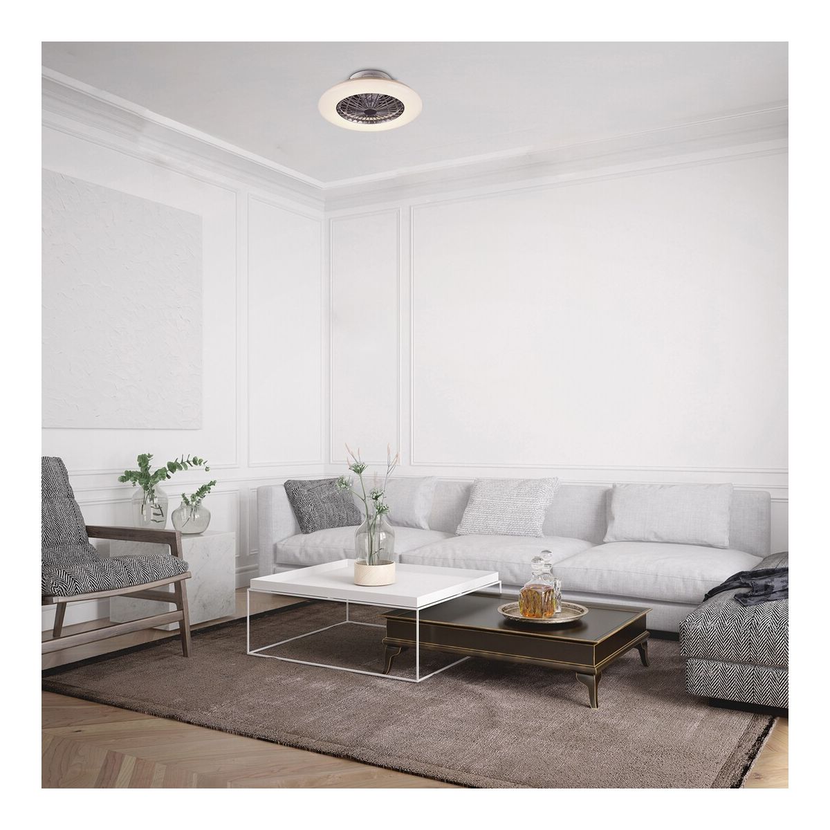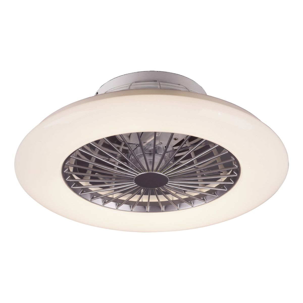 Die moderne Deckenleuchte Dalfon bietet viel mehr als nur durchschnittliche Beleuchtung: Sie verfügt über einen eingebauten Ventilator und weitere außergewöhnliche Funktionen. Dieses Modell mit Sterneneffekt eignet sich perfekt für das Wohnzimmer, das Schlafzimmer oder das Arbeitszimmer. Die runde, intelligente Lampe in Silberfarbe aus Metall wird durch einen transparenten Kunststoffschirm ergänzt. Die Dalfon-Lampe ist dimmbar, d. h. ihre Helligkeit kann nach Belieben eingestellt werden, während ihre Farbtemperatur zwischen 3000 und 6000 K angepasst werden kann. Beide Funktionen lassen sich bequem per Fernbedienung steuern. Die Geschwindigkeit des Ventilators kann in drei Stufen reguliert werden. Die Lampe verfügt außerdem über eine Nachtlichtfunktion.