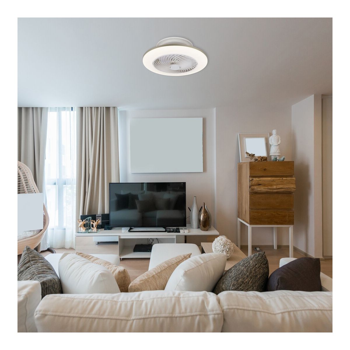 Mit der Dalfon-Deckenleuchte können Sie Platz und Geld sparen, denn dieses funktionale Modell ist sowohl eine Leuchte als auch ein Ventilator. Die Leuchte kann warmes, natürliches oder sogar kaltes, weißes Licht ausstrahlen – ganz nach Ihren aktuellen Vorlieben. Ein weiteres zusätzliches Merkmal ist die Möglichkeit, die Helligkeit der Dalfon-Lampe je nach Bedarf einzustellen, sowie eine Timer-Funktion. Diese Deckenbeleuchtung können Sie mit einer Fernbedienung steuern – außerdem können Sie zwischen drei Drehzahlstufen des Ventilators wählen.