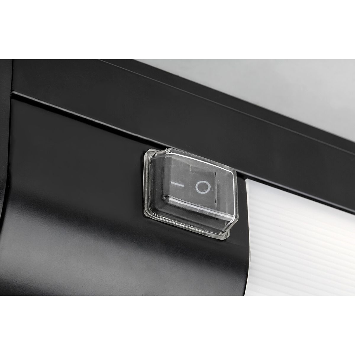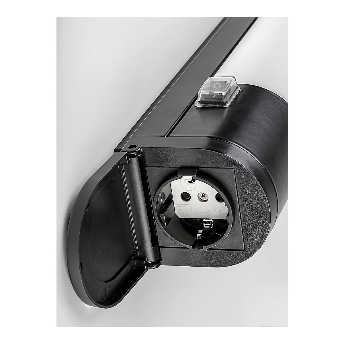 - Die schwarze Leuchte aus Metall und Kunststoff wird durch einen weißen Kunststoffschirm ergänzt