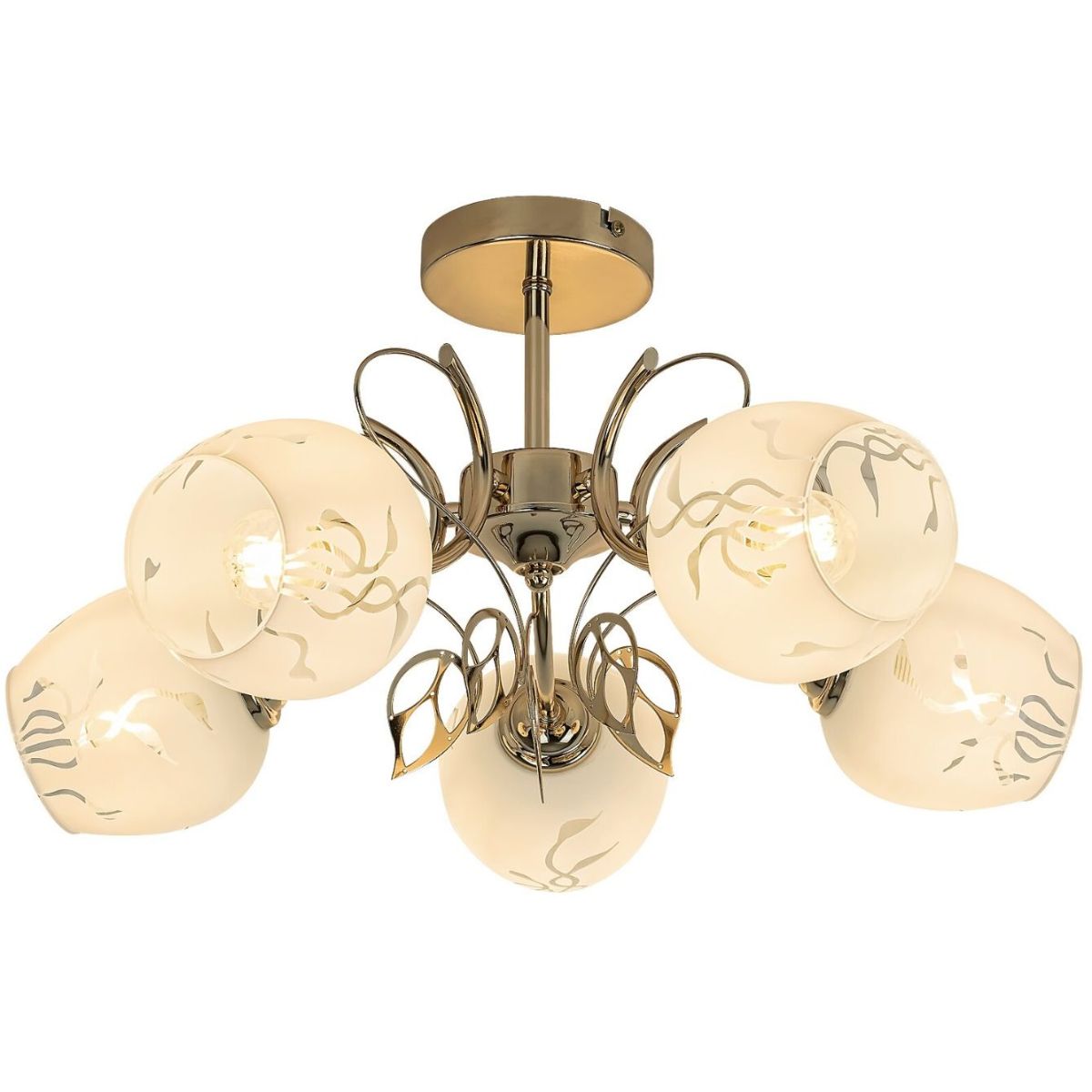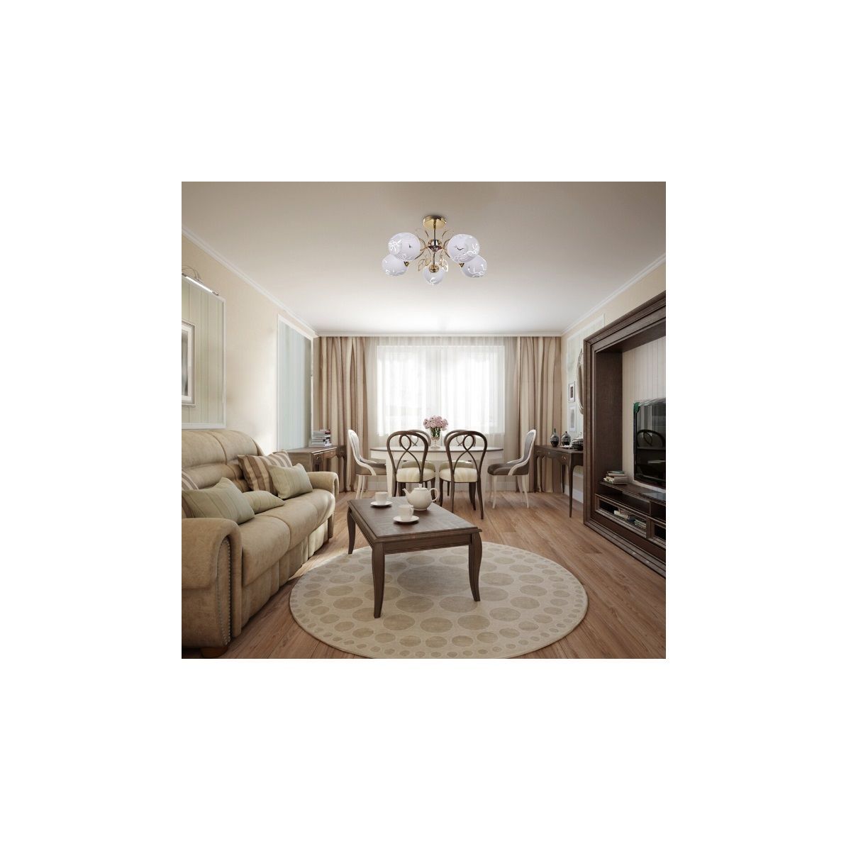 Die klassische 5-flammige Deckenleuchte Fauna ist eine elegante Ergänzung für Ihr traditionelles Wohn- oder Schlafzimmer. Die weißen Glaslampenschirme mit Muster sind an einem goldenen Metallrahmen befestigt. Die Leuchte kann mit einem runden Ziersockel an der Decke befestigt werden. Die runden Lampenschirme mit offenem Boden sind an den gedrehten Armen der Lampe befestigt und mit goldenen Blättern verziert.