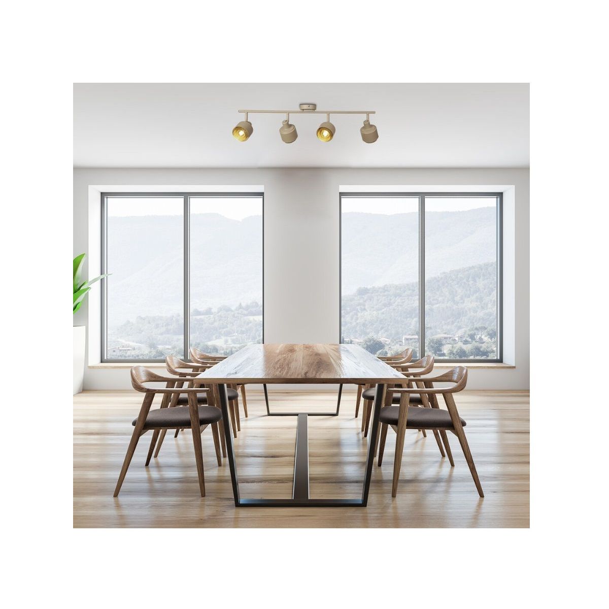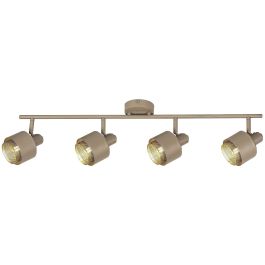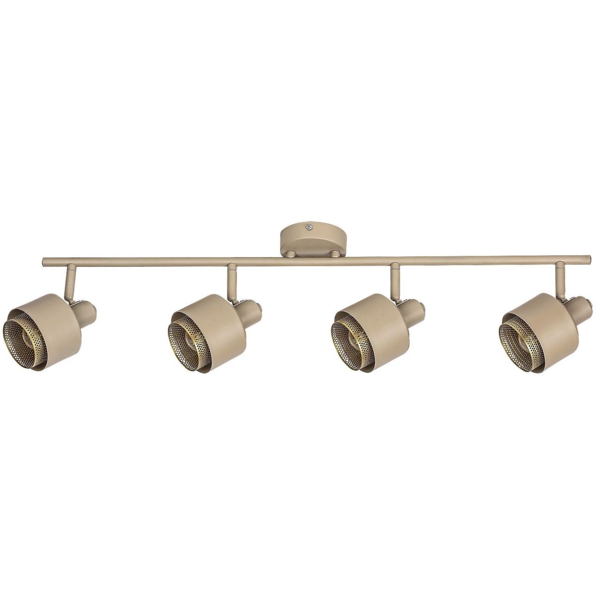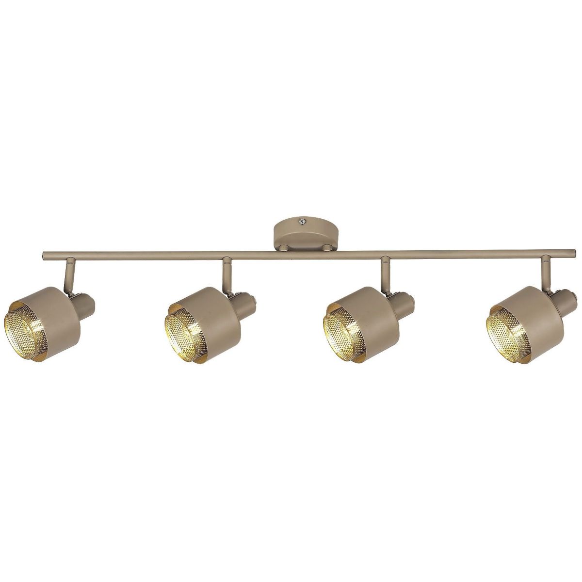Die vierfache Spotbeleuchtung Fedora im modernen Stil ist eine hervorragende Ergänzung für Ihr Wohn- oder Schlafzimmer. Die vollständig aus Metall gefertigte Leuchte in Hellbraun und Gold wird mit einem runden, dekorativen Sockel an der Decke befestigt. Ihre Besonderheit sind die perforierten, zylindrischen Innenlampenschirme in Goldfarbe, die über die hellbraunen Außenlampenschirme hinausragen.