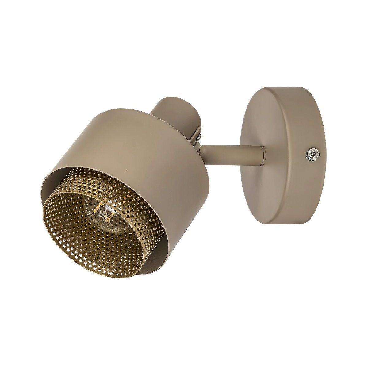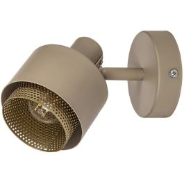 Die moderne Spotbeleuchtung Fedora ist eine hervorragende Ergänzung für Ihr Wohn- oder Schlafzimmer. Diese vollständig aus Metall gefertigte Wandleuchte in Hellbraun und Gold wird mit einem runden, dekorativen Sockel an der Wand befestigt. Ihr besonderes Merkmal ist der perforierte, zylindrische Innenschirm in Goldfarbe, der über den hellbraunen Außenschirm hinausragt.