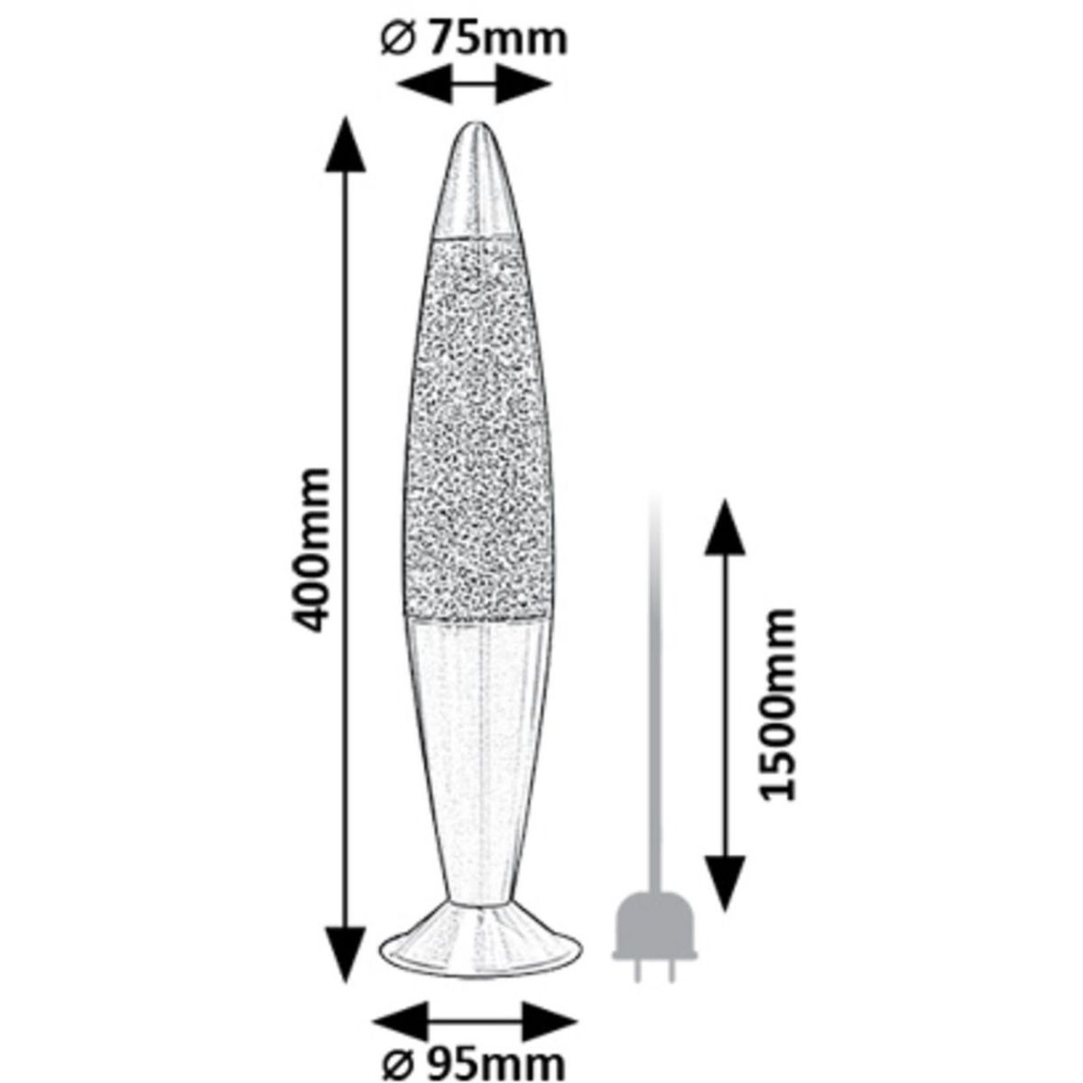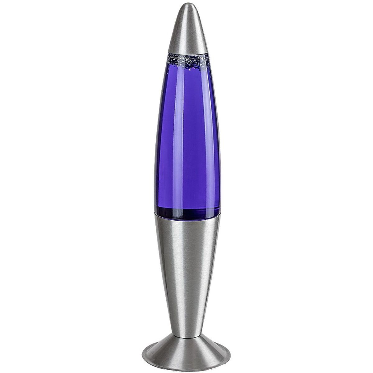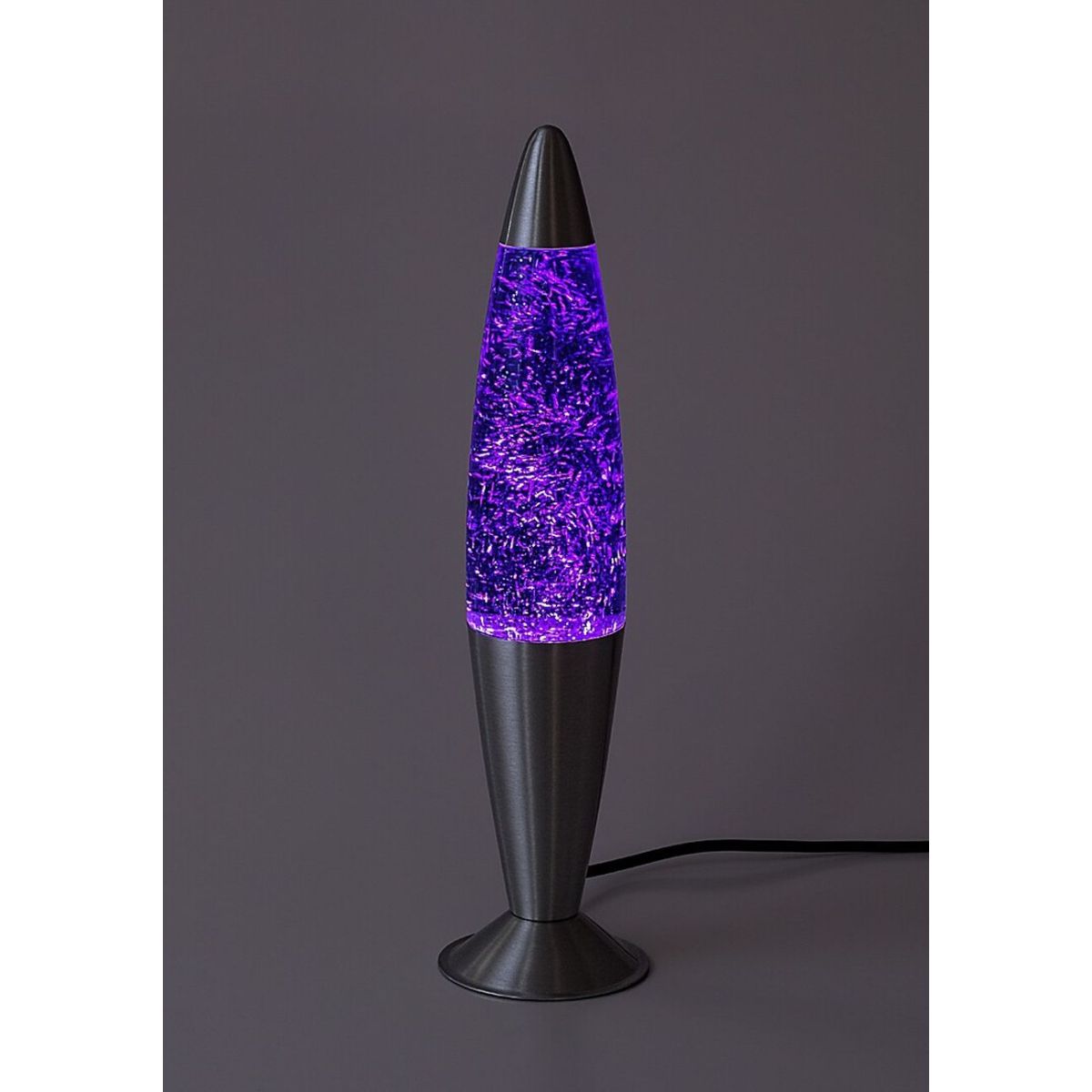 - Das Innere der Lampe ist mit einer violetten Flüssigkeit gefüllt, in der silberne Funken schweben