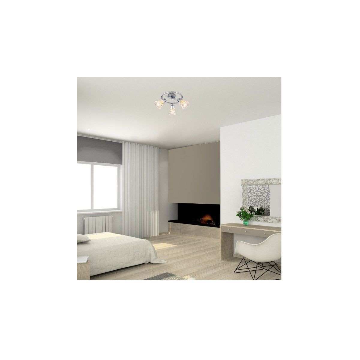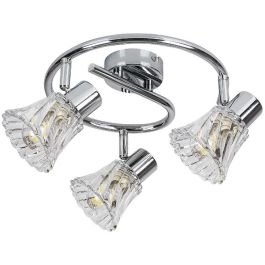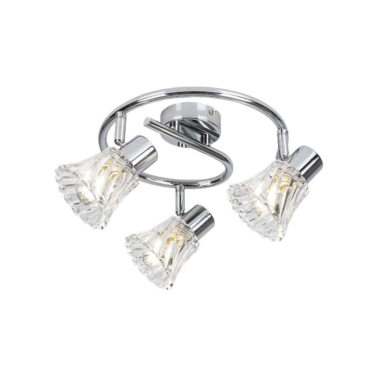 Die dreifache Spotlampe Hestia im klassischen Stil ist ein elegantes Einrichtungselement für Ihr Wohn- oder Schlafzimmer. Die runde Metallfassung in Chromfarbe wird durch transparente Glasschirme ergänzt. Die Lampe kann mit einem runden Ziersockel an der Decke befestigt werden. Das charakteristische Merkmal der glockenförmigen Lampenschirme ist der verdrehte Effekt ihrer gewellten Oberflächen. Die drei in verschiedene Richtungen ausgerichteten Lampenschirme sorgen für eine vollständige Ausleuchtung des Raumes.