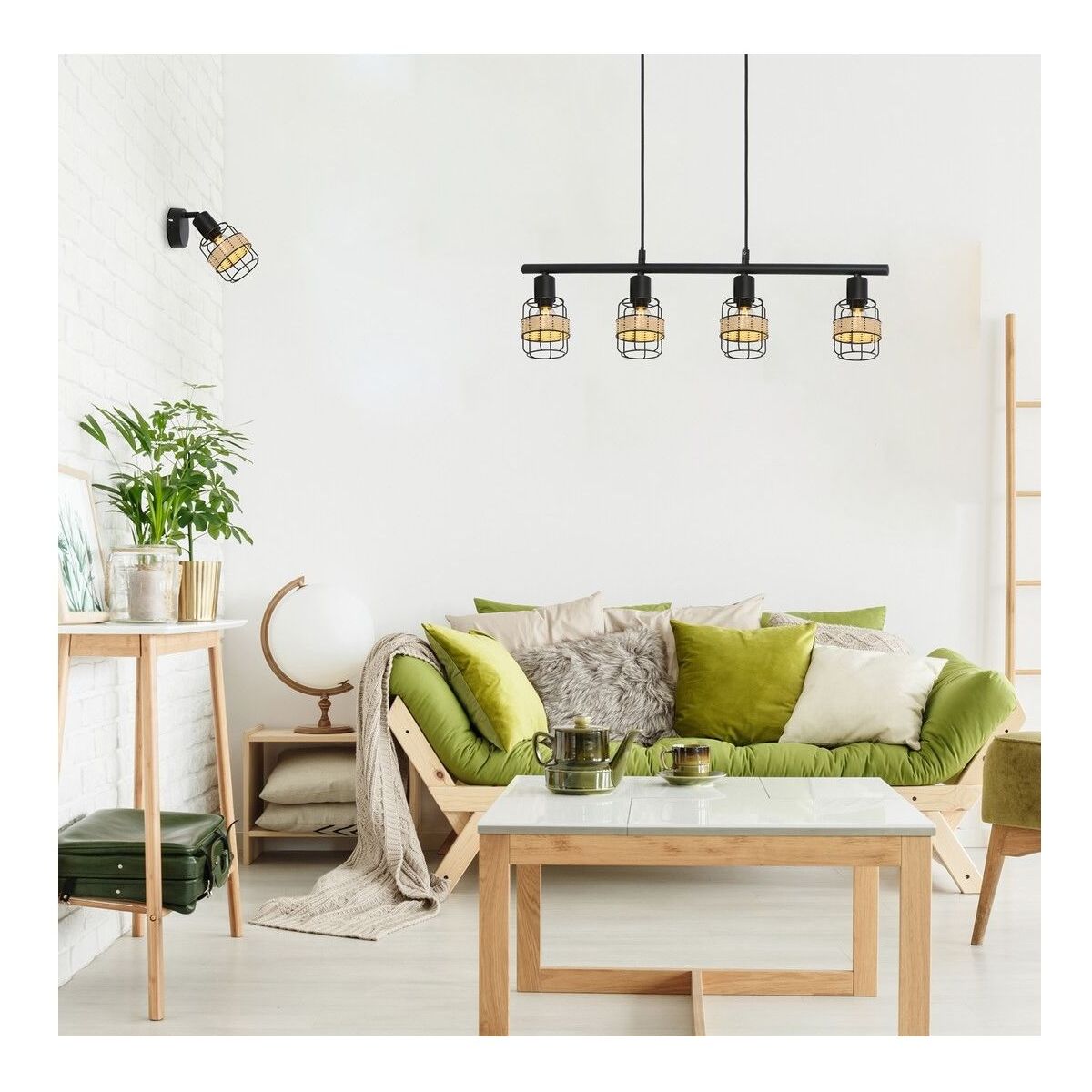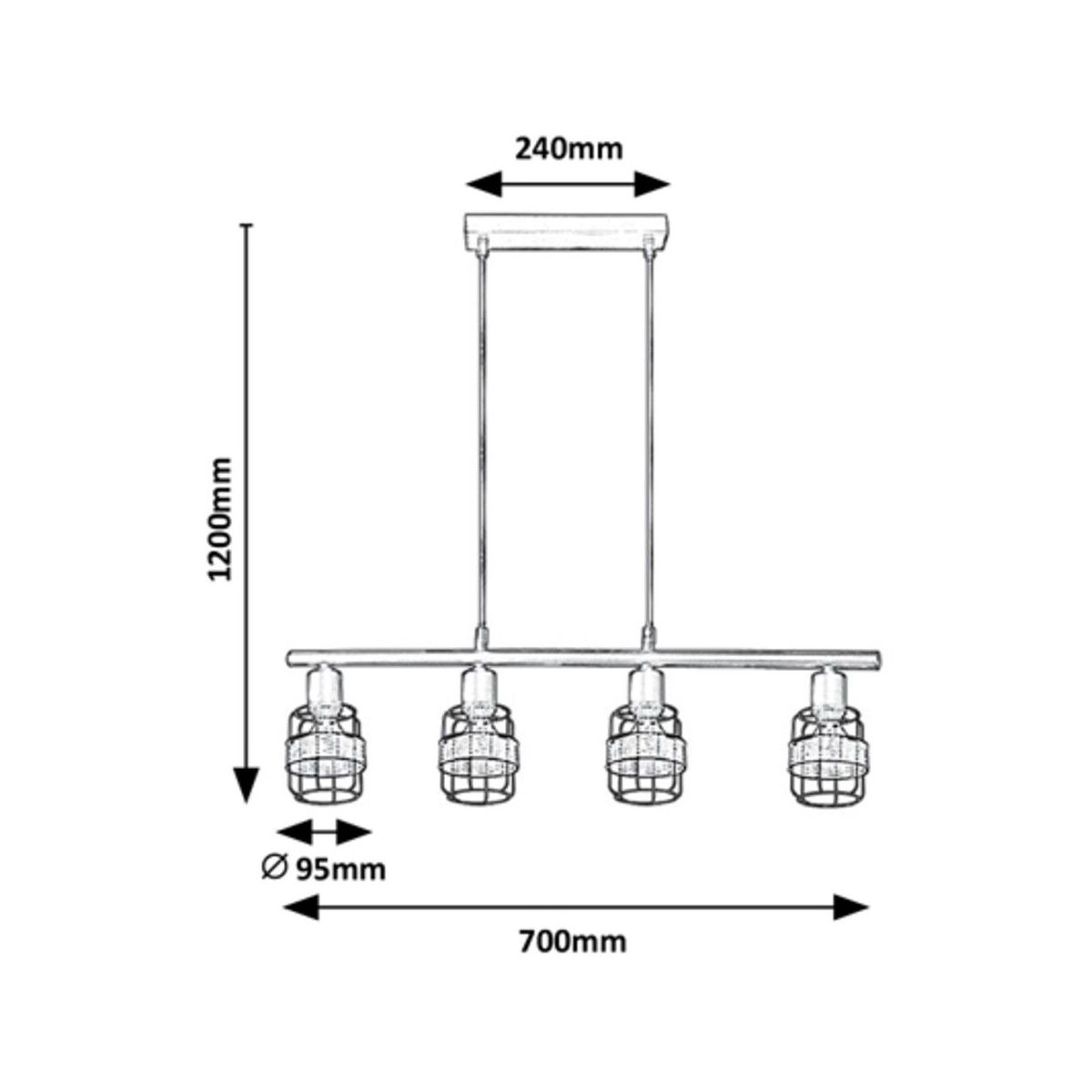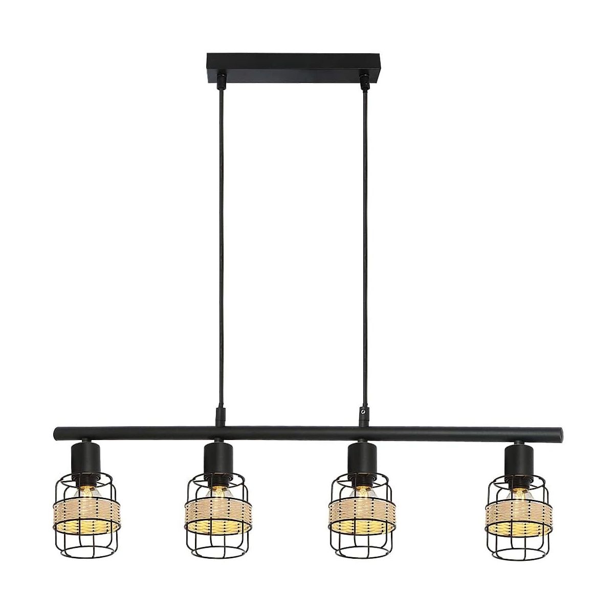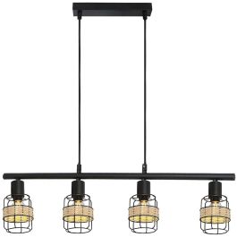 Die 4-flammige Pendelleuchte Indiana im Industrial-Stil wird zu einem charakteristischen Element Ihrer modernen Einrichtung im Wohnzimmer, Schlafzimmer, Esszimmer oder in der Küche. Dieses mattschwarze Modell aus Metall wird durch Gitterlampenschirme und eine natürliche gewebte Verzierung um diese herum ergänzt. Die Indiana-Lampe kann mit einem länglichen, quadratischen Dekosockel an der Decke befestigt werden. Die Lampenköpfe sind auf einem langen Trägerbalken angebracht. Diese Hängelampe kann mit vier Glühbirnen mit einer Leistung von jeweils bis zu 25 W verwendet werden. Der Sockeltyp ist E14. Wenn Sie eine intime, gemütliche Atmosphäre schaffen möchten, wählen Sie für dieses Modell Glühbirnen, die ein warmes, weißes Licht abgeben. Die Abmessungen der 4-Punkt-Hängelampe Indiana sind: Breite 70 cm, Durchmesser jedes Lampenschirms 9,5 cm, Abstand zur Decke 120 cm. Dieses Modell wird ohne Leuchtmittel geliefert.