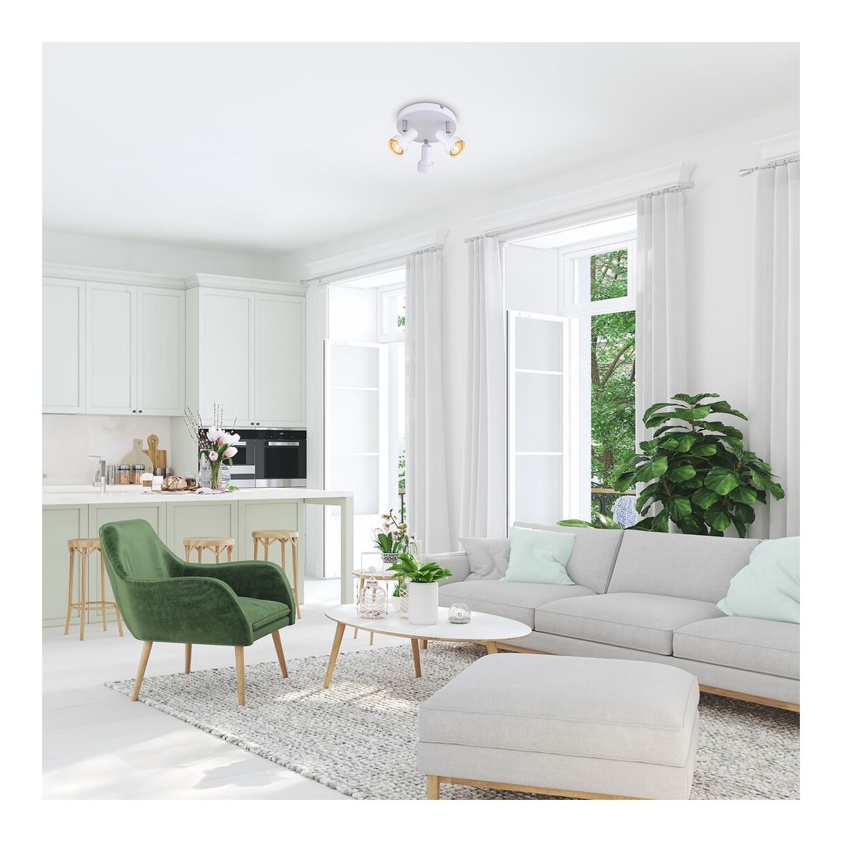 Die klassische Dreifach-Spotbeleuchtung Konrad ist eine frische, angenehme Ergänzung für Ihr Wohnzimmer, Schlafzimmer oder Kinderzimmer. Sie passt perfekt zu fast jedem Interieur in hellen Pastellfarben. Dieses mattweiße Modell ist vollständig aus Metall gefertigt und kann mit einem großen, runden Zierfuß an der Decke befestigt werden. Die Lampenschirme sind zylindrisch und nach unten hin erweitert. Dank der drei in verschiedene Richtungen ausgerichteten Lampenköpfe beleuchtet dieses Modell jeden Raum perfekt.