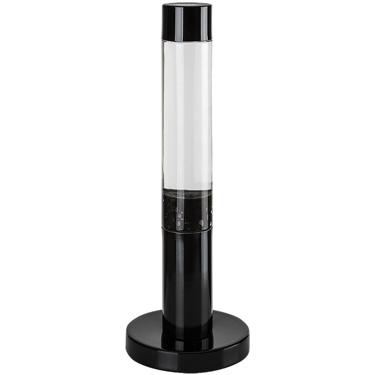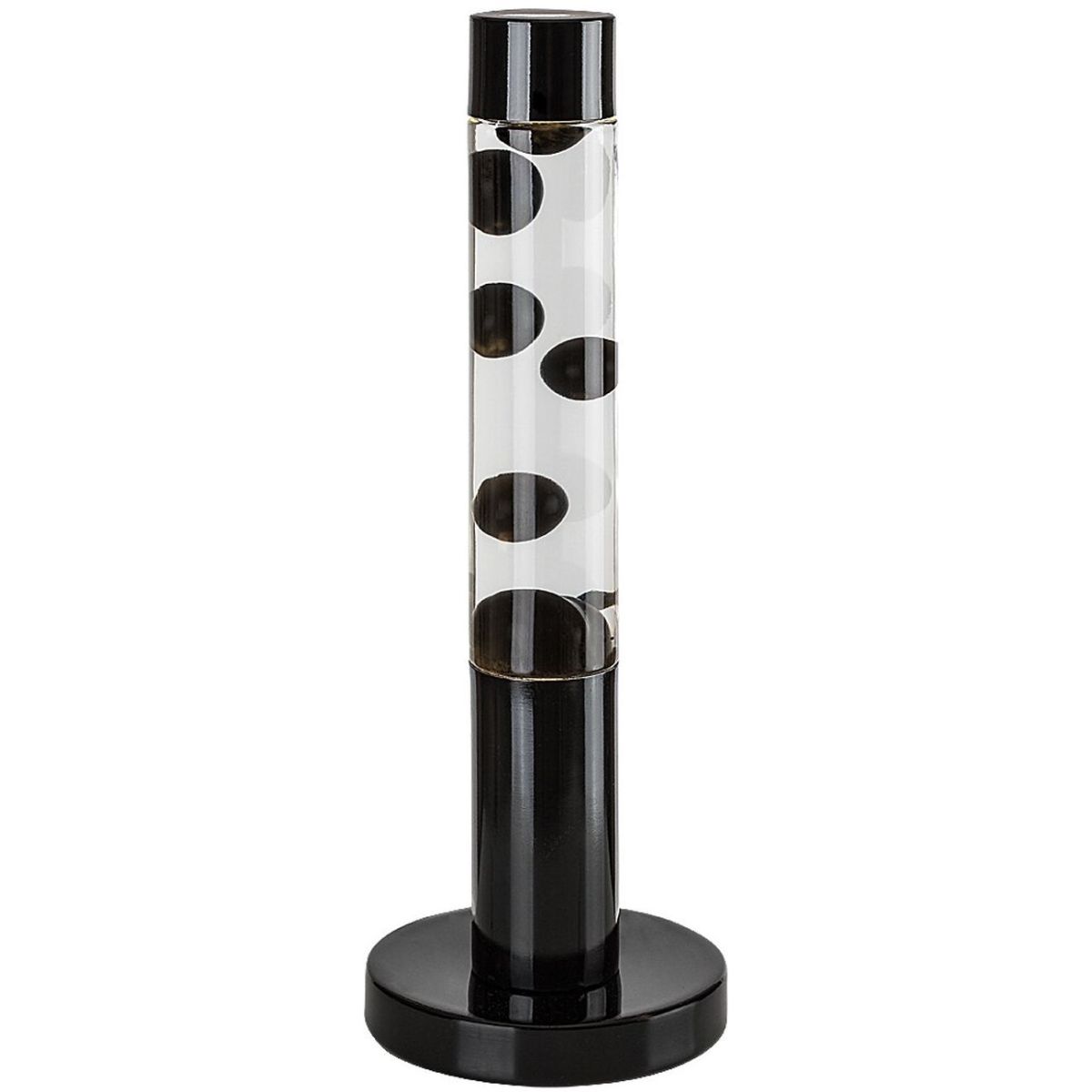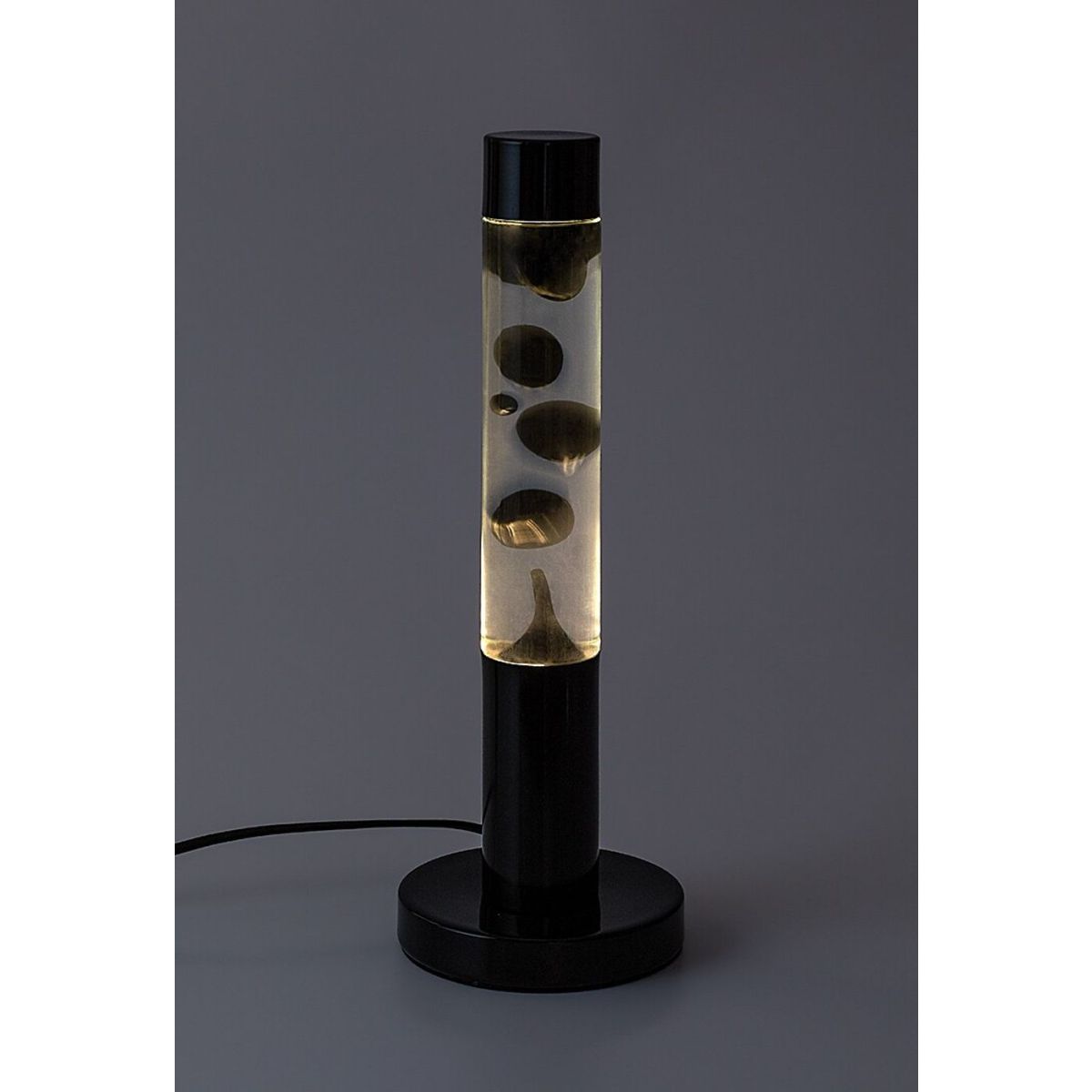 - Im Inneren der Lampe befindet sich eine transparente Flüssigkeit mit schwarzem Wachs, das sich langsam hin und her bewegt