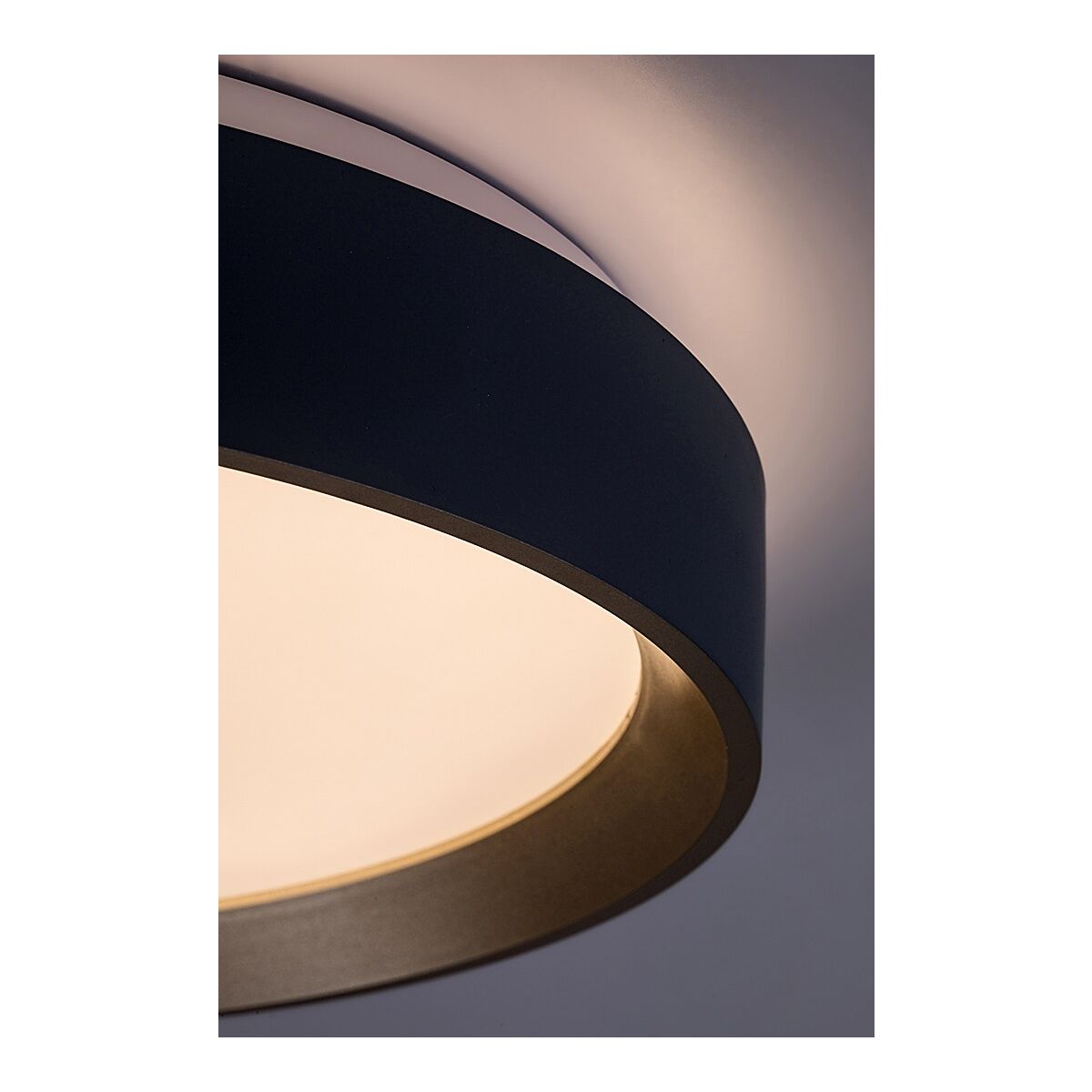 - Die graue Metallfassung wird durch einen weißen Kunststoffschirm ergänzt.