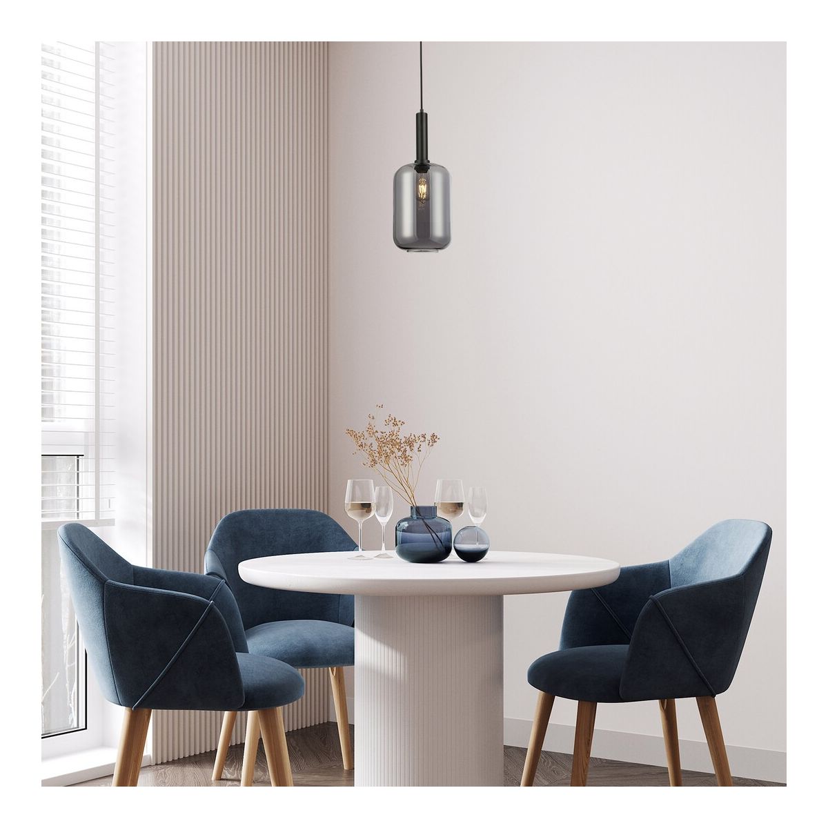 - Die aus Metall gefertigte Fassung in mattem Schwarz wird durch einen vertikalen, zylindrischen Lampenschirm aus getöntem Glas ergänzt
