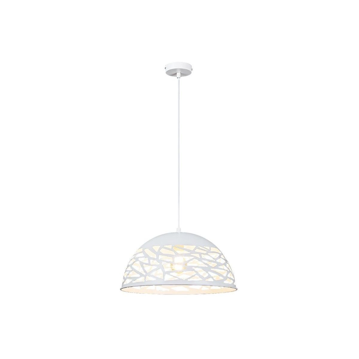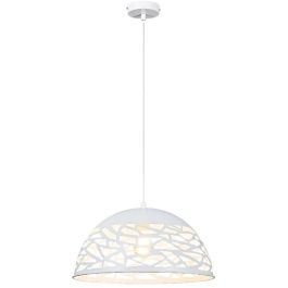 Die Hängelampe Norena ist ein dezentes und zugleich stilvolles Element Ihrer modernen Wohn- oder Esszimmereinrichtung. Dieses mattweiße Modell ist vollständig aus Metall gefertigt; die Lampe kann mit einem kleinen, runden Zierfuß an der Decke befestigt werden. Zufällige Muster, die in den halbkugelförmigen Lampenschirm geschnitten sind, lassen das Licht frei streuen und schaffen so einen schönen, hellen Raum.