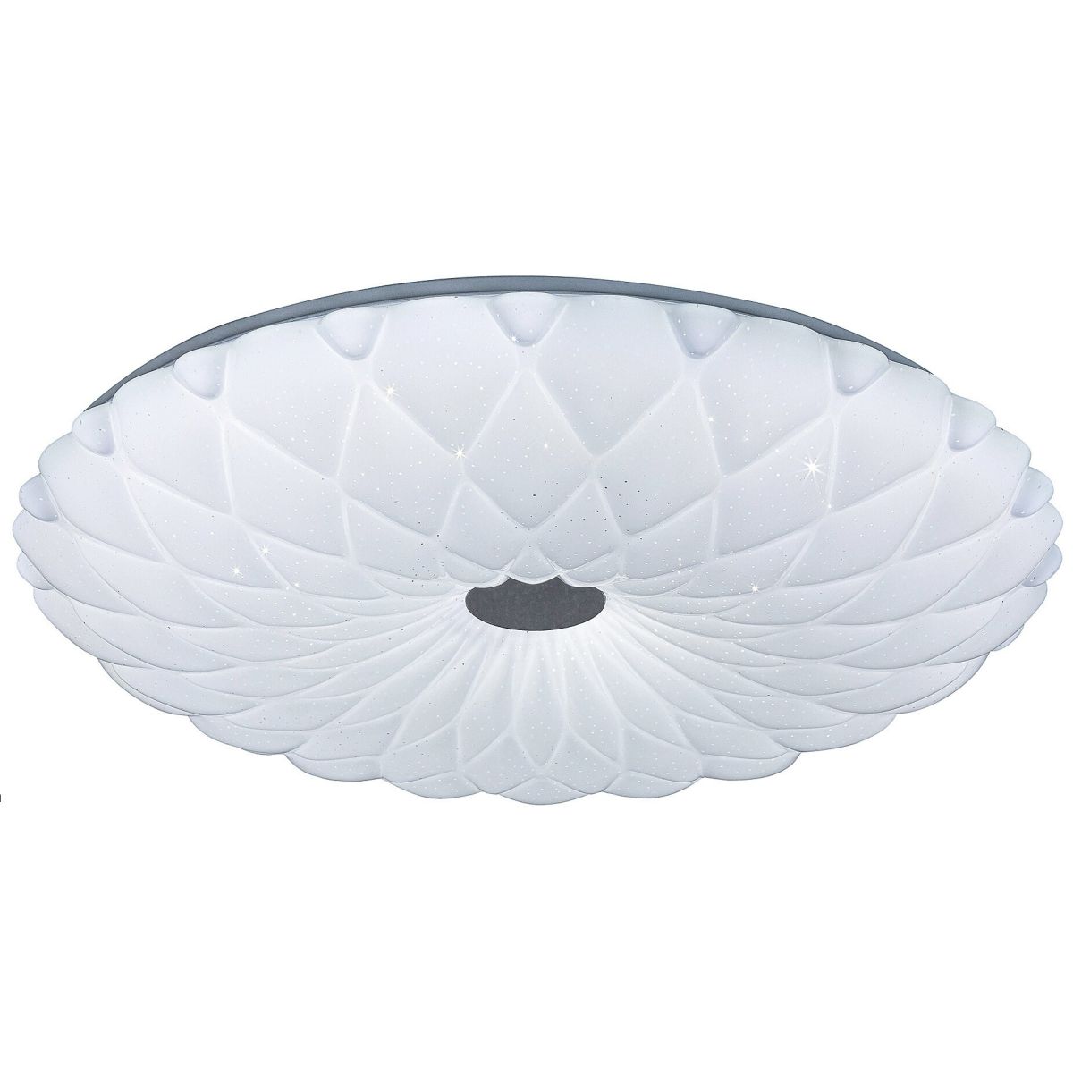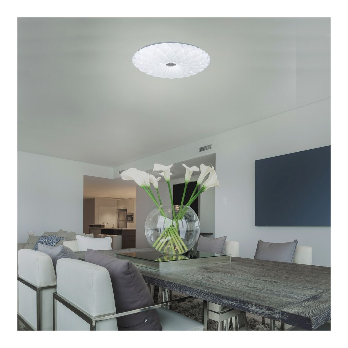 Dank ihrer zahlreichen Zusatzfunktionen kann die große runde Deckenleuchte Primrose in verschiedenen Räumen Ihrer Wohnung installiert werden. Diese weiße, moderne Leuchte besteht aus Metall und Kunststoff und verfügt über eine integrierte, energiesparende LED-Lichtquelle. Die Primrose-Leuchte ist dimmbar, sodass Sie die Helligkeit nach Ihren Bedürfnissen regulieren können, und verfügt über eine Timer-Funktion. Die runde Deckenleuchte mit einem Durchmesser von 480 mm kann per Fernbedienung gesteuert werden.